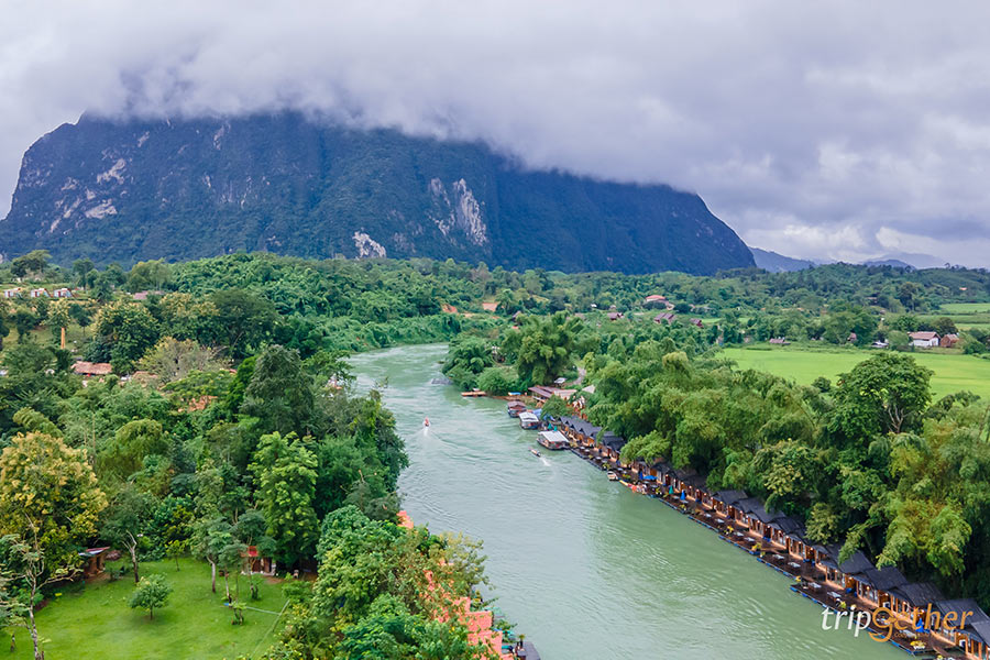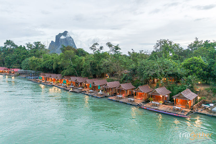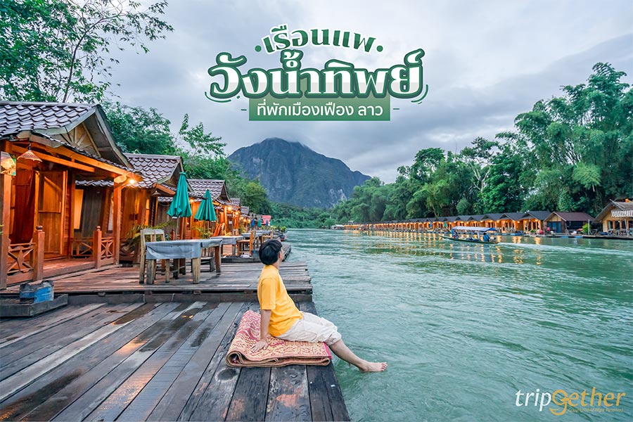 เรือนแพวังน้ำทิพย์ ที่พักเมืองเฟือง ลาว นอนแพริมน้ำ บรรยากาศสุดกรีน
