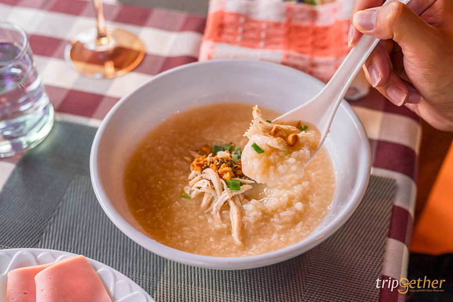 ในส่วนของอาหารเช้าที่เรือนแพวังน้ำทิพย์จะเสิร์ฟมาเป็นแบบ breakfast แฮม ไข่ดาว มาพร้อมกับข้าวต้มไก่ฉีกร้อนๆ ที่อร่อยมาก