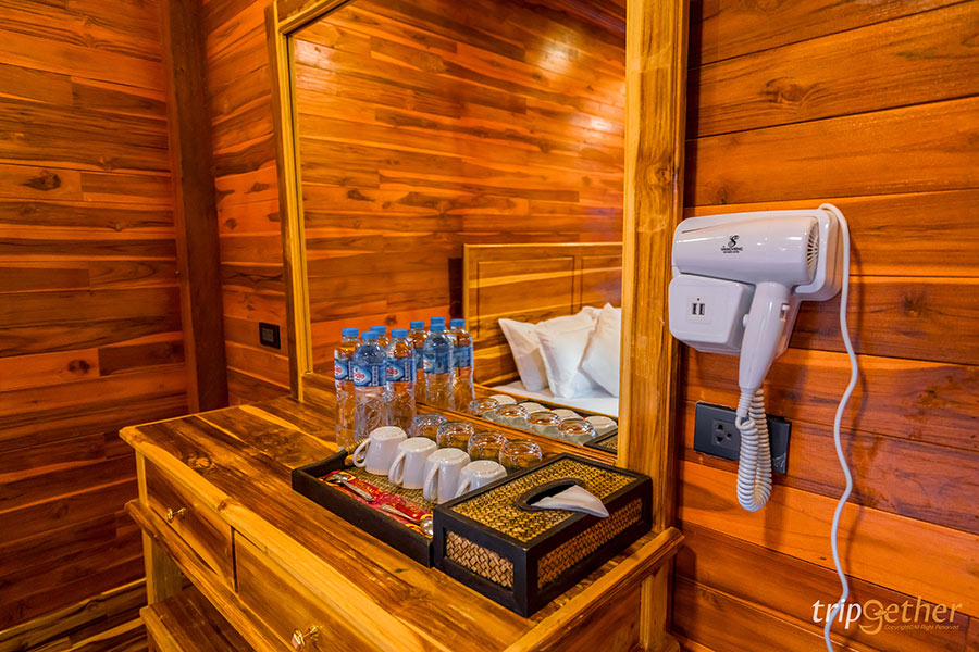 นอกจากนี้ภายในห้องยังมีสิ่งอำนวยความสะดวกอย่างครบครัน ชุดชา กาแฟ น้ำดื่ม และไดร์เป่าผม