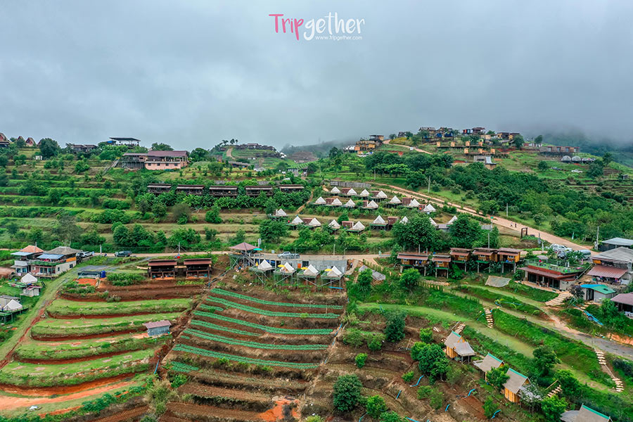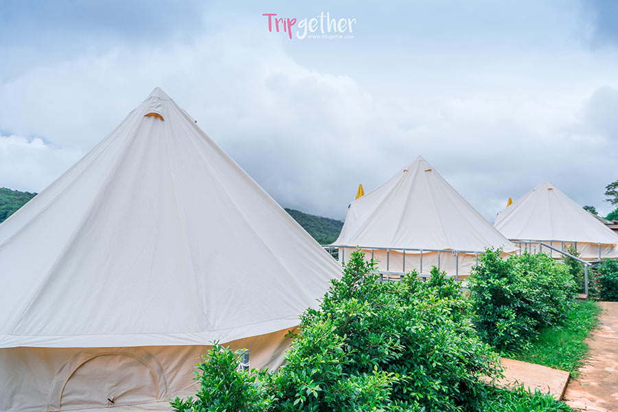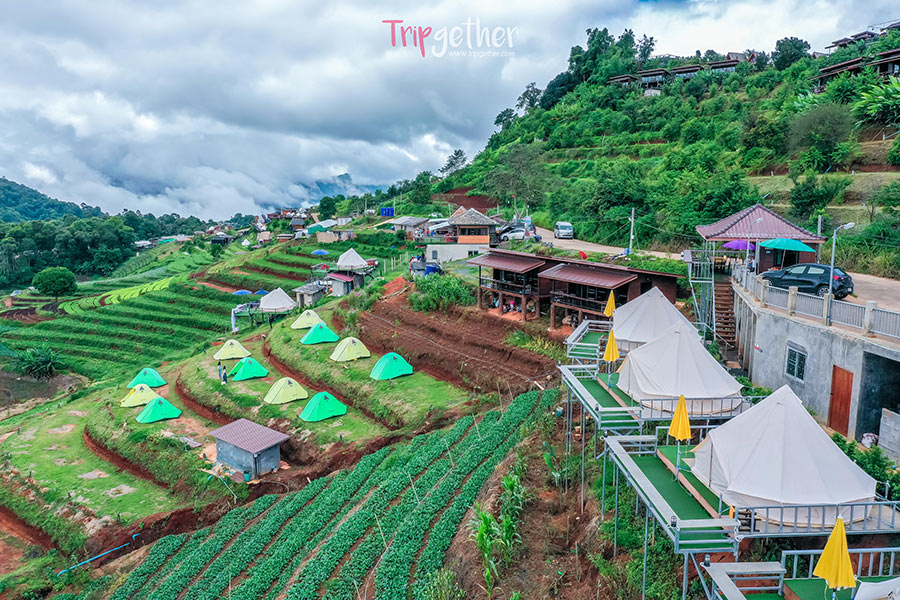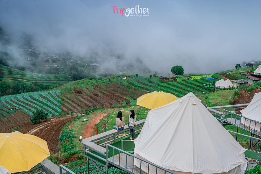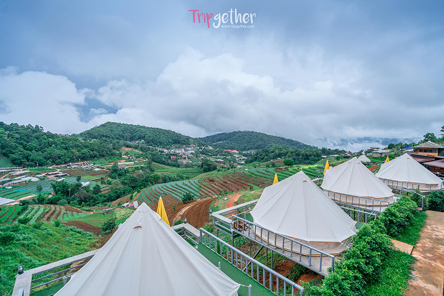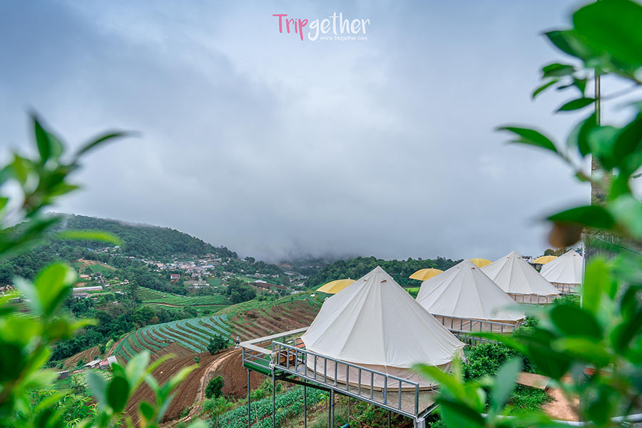 เต็นท์ VIP (เต็นท์กระโจมขาว) จะตั้งอยู่บริเวณพื้นที่ด้านบนสุดของเนินเขา มีทั้งหมด 4 หลังด้วยกัน แต่ละหลังจะหันหน้าออกสู่วิวดอย สามารถชมวิวได้ไกลสุดสายตาโดยมีเทือกเขาน้อยใหญ่สลับกันไปมาและยังมองเห็นไร่ผักของชาวบ้านที่ปลูกไร่เฉดสีกันได้อย่างสวยงามอีกด้วย