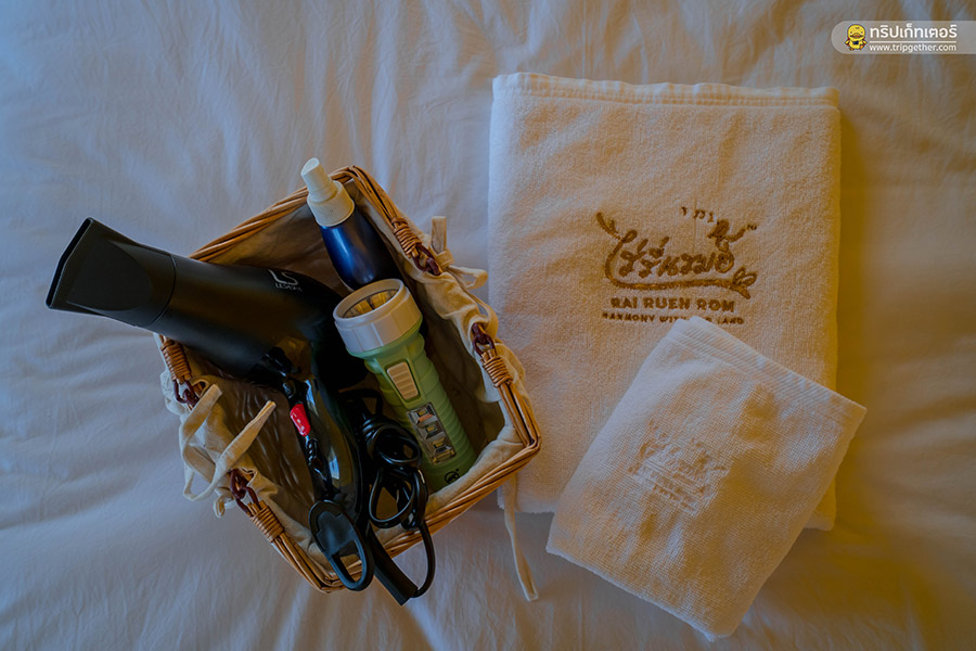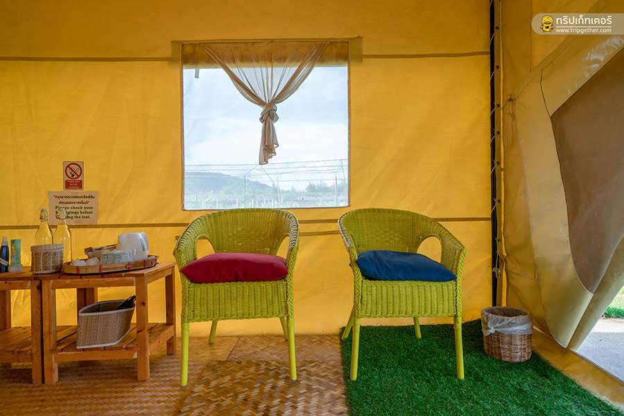 ด้านในแบ่งพื้นที่ได้อย่างลงตัว มีมุมพักผ่อนให้นั่งจิบชา พูดคุยกันพอหอมปากหอมคอ และยังมีสิ่งอำนวยความสะดวกอื่นๆ อย่างพร้อมสรรพไม่ว่าจะเป็น พัดลมไอน้ำ ไดร์เป่าผม กาต้มน้ำ เครื่องดักยุง ไฟฉาย และร่ม