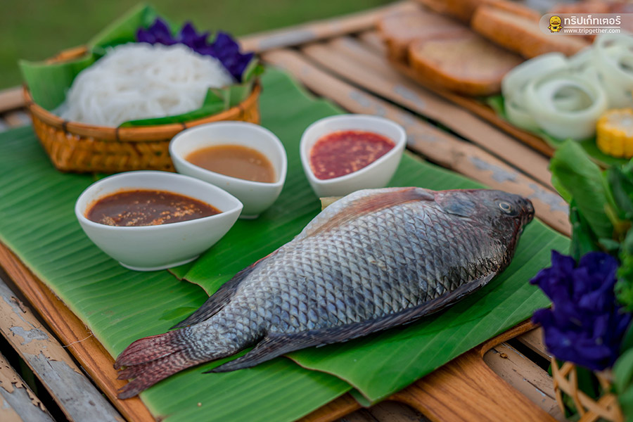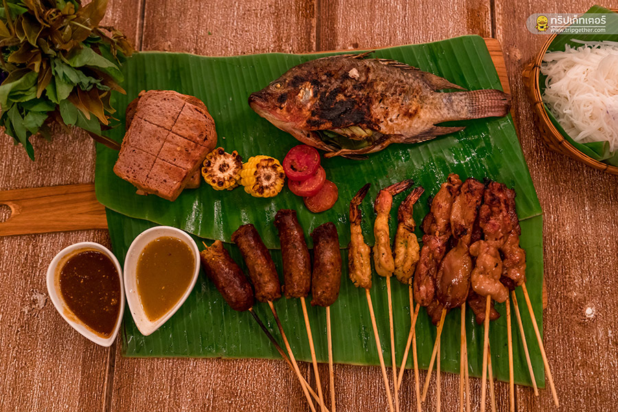 ชุดบาร์บีคิว 1 เซ็ตมีกุ้ง หมู ไก่ ไส้อั่ว ปลาเผา มะเขือเทศ ข้าวโพด หอมใหญ่ กระเจี๊ยบเขียว ผักตามฤดูกาล ขนมปังโฮมเมด และขนมจีน