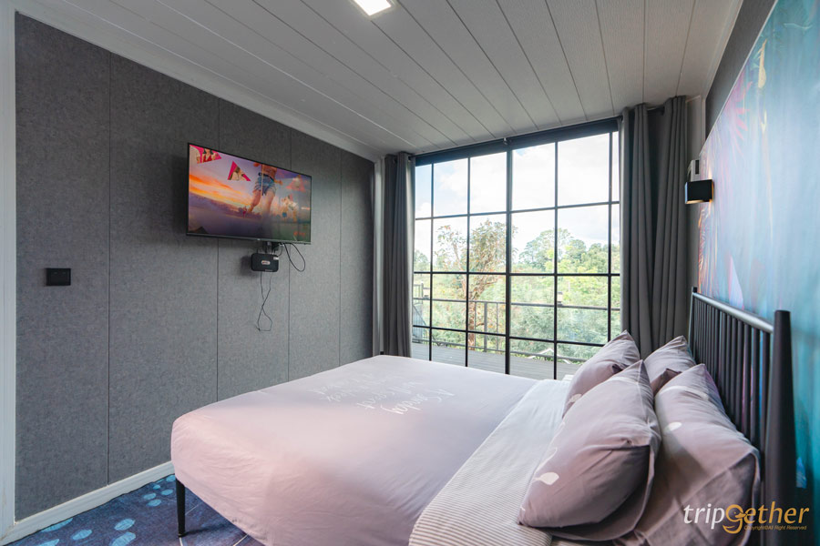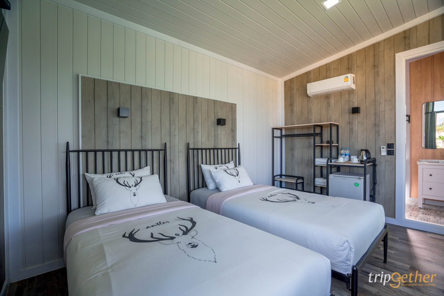 ใครมาพักเป็นคู่ หรืออยากได้พื้นที่ใช้สอยเยอะขึ้น แนะนำ บ้านกล่องแบบเตียงคู่ ห้องพักตกแต่งด้วยโทนสีขาวสะอาดตา เพดานสูง ทำให้บรรยากาศภายในดูโปร่งและโล่งเป็นพิเศษ จุดเด่นคือประตูและหน้าต่างกระจกบานใหญ่ ที่ทำให้สามารถมองเห็นวิวธรรมชาติได้จากบนเตียง