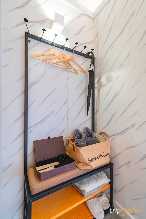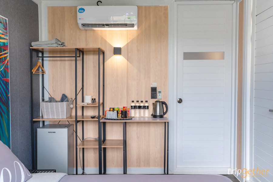 ภายในมีสิ่งอำนวยความสะดวกครบ ทั้งโทรทัศน์ แอร์ ตู้เย็น กาน้ำร้อน และห้องน้ำส่วนตัว มีโซนมินิบาร์เล็กๆ พร้อมน้ำดื่มและขนม วางติดกับตู้เสื้อผ้าแบบเปิดโล่ง ใช้งานสะดวก ไม่อึดอัด