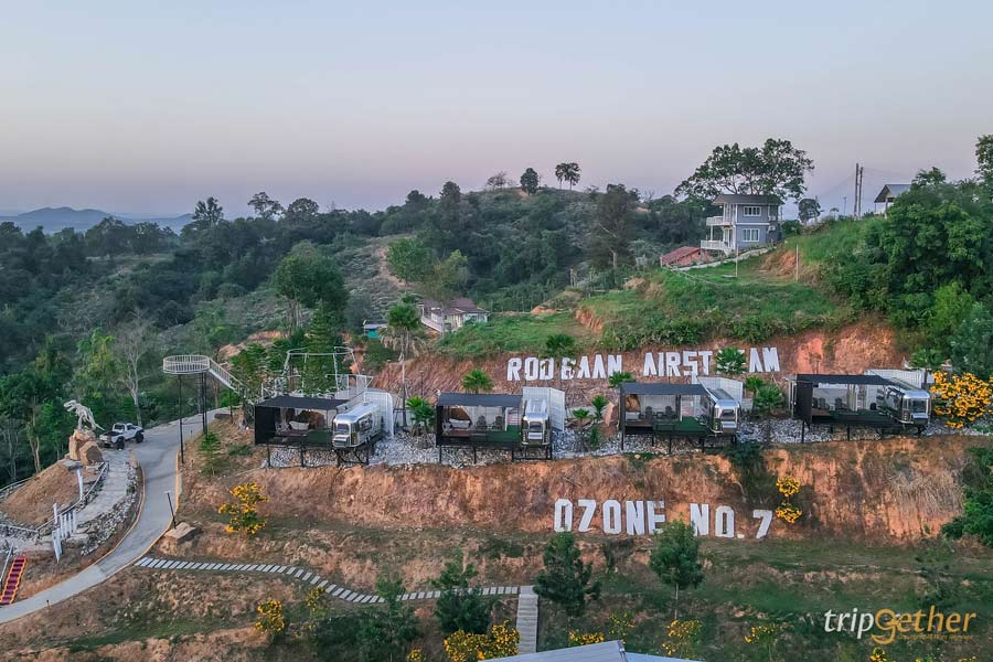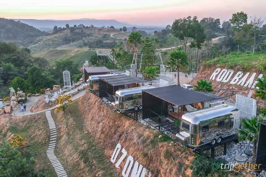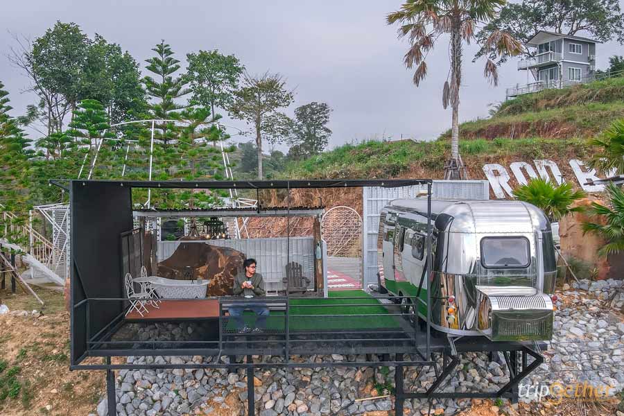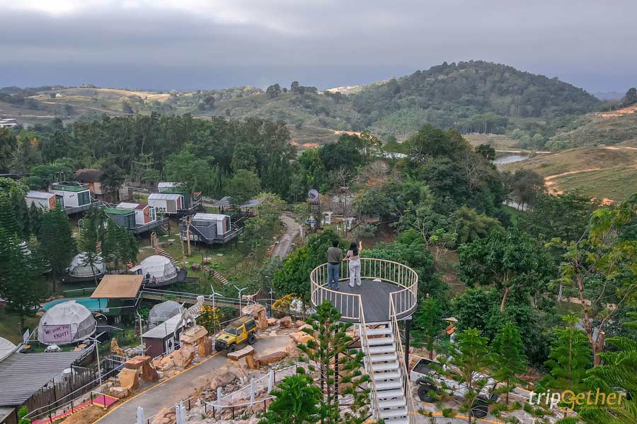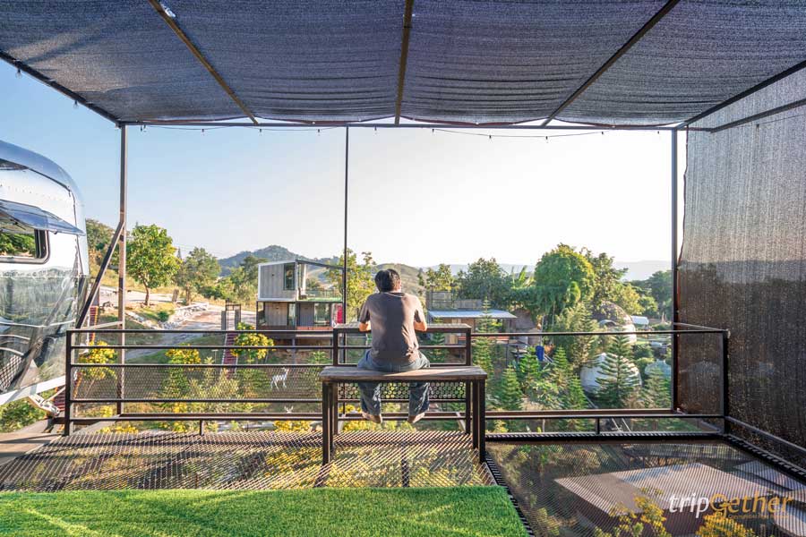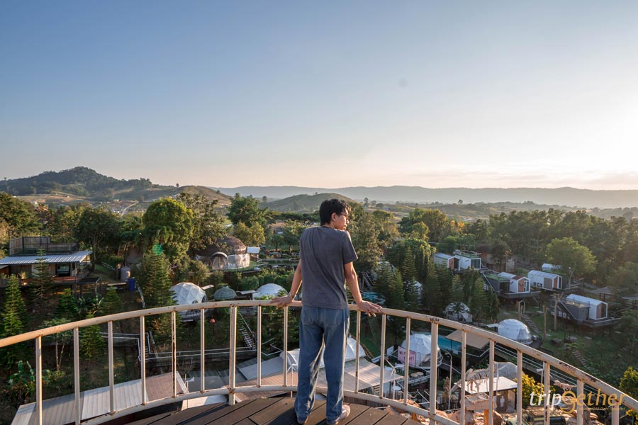 อีกหนึ่งไฮไลท์ของโซนรถบ้านที่ห้ามพลาดคือ จุดสูงสุด Tower รถบ้านดูวิว เป็นจุดชมวิวมุมสูงแบบ 360 องศา เดินชมวิวได้รอบทิศ ไม่มีอะไรมาบดบังสายตา ช่วงเย็นเป็นช่วงเวลาที่สวยมาก พระอาทิตย์ค่อยๆ ลับขอบฟ้า แสงสีทองตกกระทบภูเขาเขียวๆ เป็นภาพที่เห็นแล้วต้องหยุดยืนมองเลยล่ะ