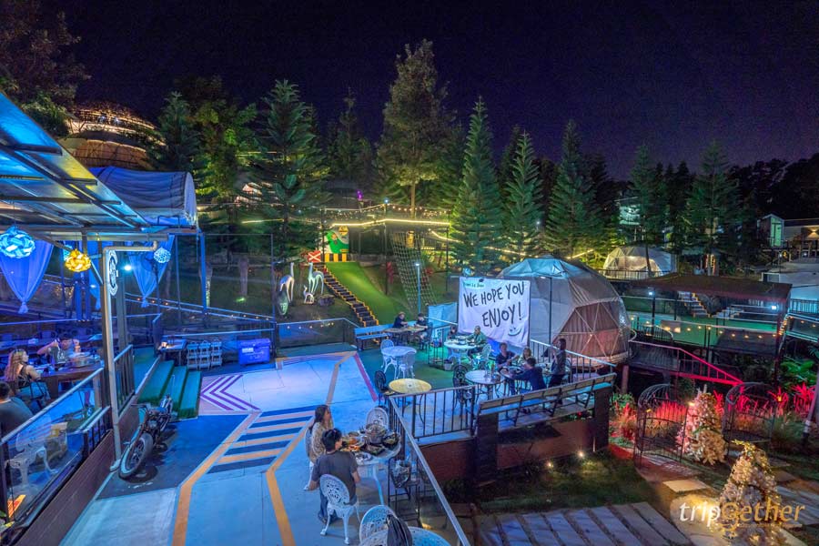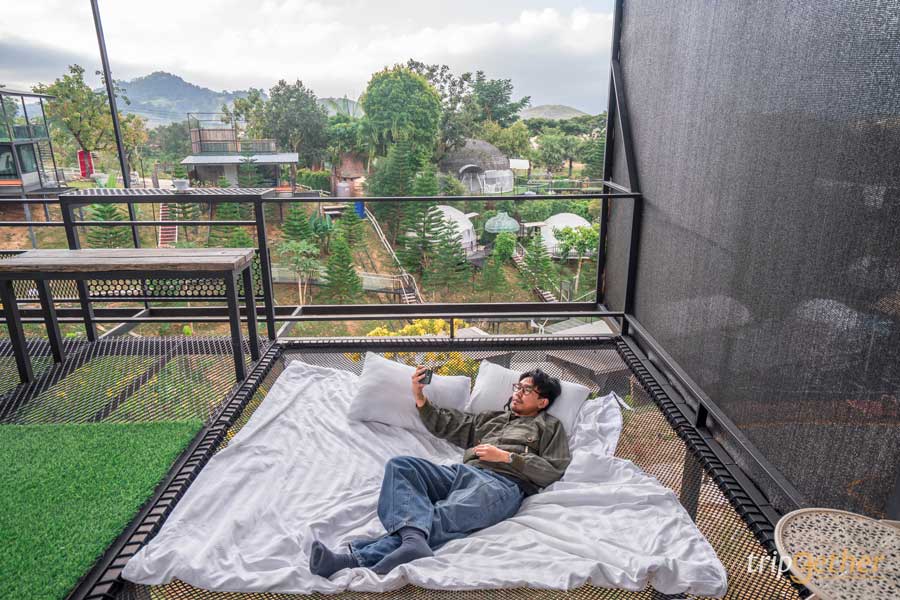 พื้นที่ด้านนอกกว้างขวาง มีมุมให้นั่งชิลล์เพียบ ทั้งเก้าอี้ไม้ เปลตาข่ายสำหรับนอนดูวิว กลางวันชมเขา กลางคืนชมดาว ขอบอกเลยว่าดาวที่นี่เยอะและสวยมาก เงยหน้ามองท้องฟ้าแล้วแทบไม่อยากละสายตา
