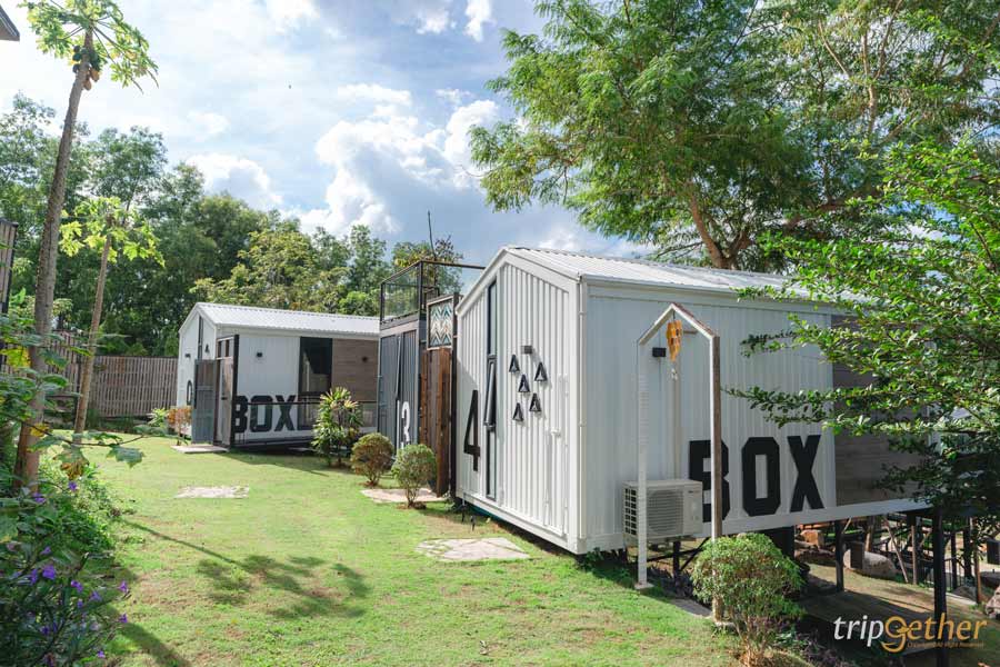 โซนบ้านกล่อง มีทั้งหมด 9 หลัง แบ่งออกเป็น บ้านกล่องแบบเตียงเดี่ยว ตกแต่งในสไตล์โมเดิร์น คุมโทนอย่างลงตัว เฟอร์นิเจอร์เลือกใช้แบบเรียบแต่ดูดี มีประตูกระจกบานใหญ่ ที่เปิดรับแสงธรรมชาติ และมองเห็นวิวด้านนอกได้แบบเต็มตา ทำให้ห้องดูโปร่ง โล่ง และน่าอยู่มาก