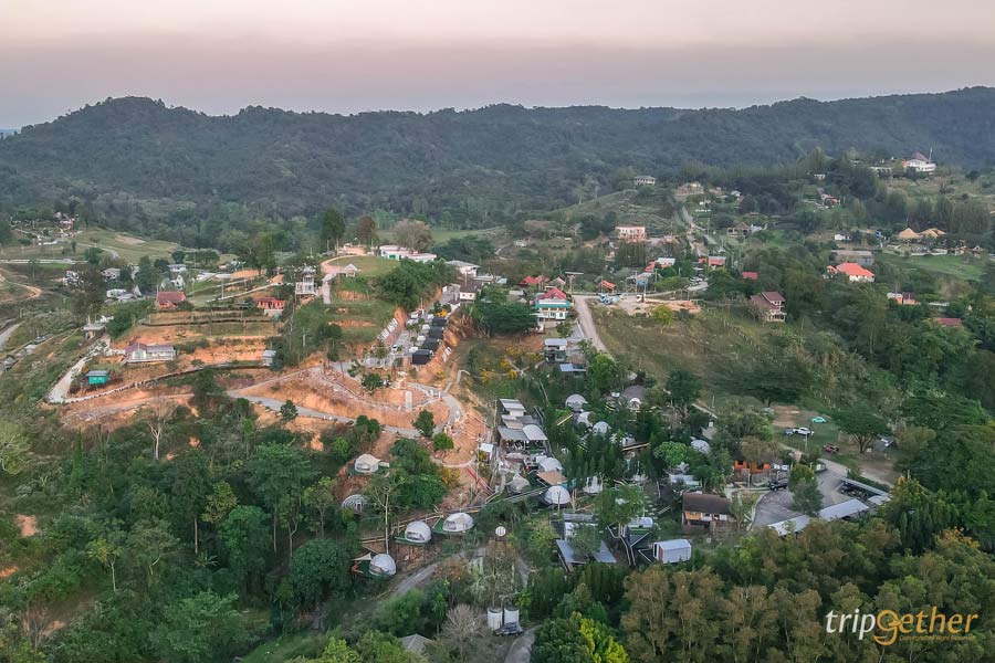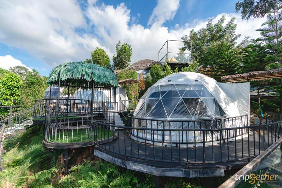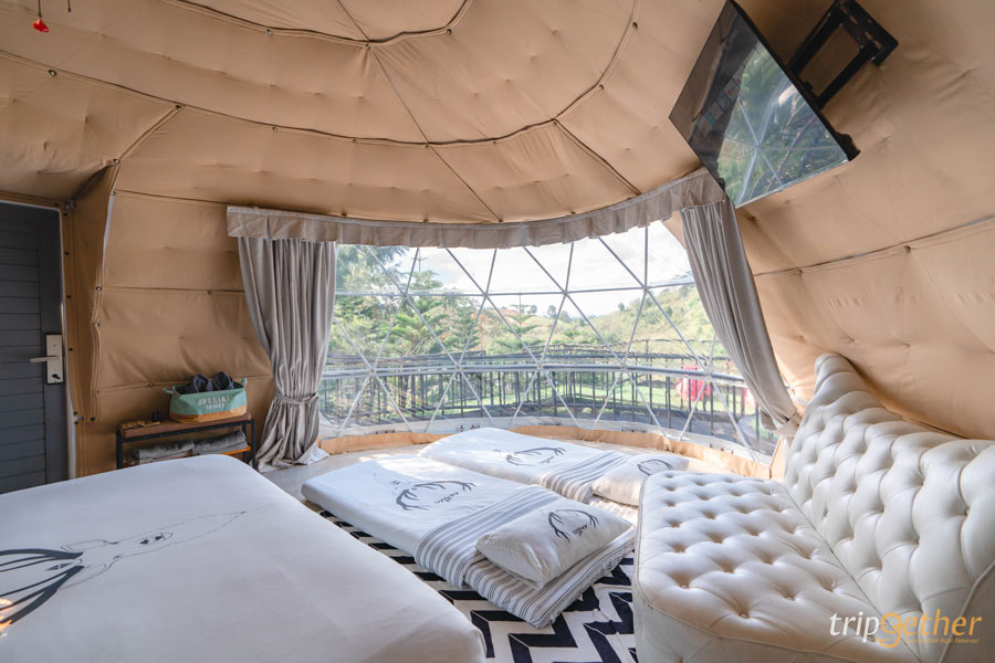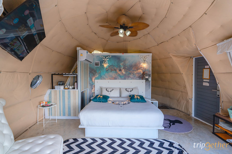 ภายในตกแต่งด้วยโทนสีครีม ดูอบอุ่นและสบายตา เสริมความสวยหรูด้วยวอลเปเปอร์ เฟอร์นิเจอร์ โคมไฟ และผ้าม่าน พร้อมสิ่งอำนวยความสะดวกครบครัน ไฮไลท์ของเต็นท์โดมอยู่ที่ ผนังใส ที่สามารถนอนมองวิวธรรมชาติได้จากบนเตียงแบบเต็มๆ