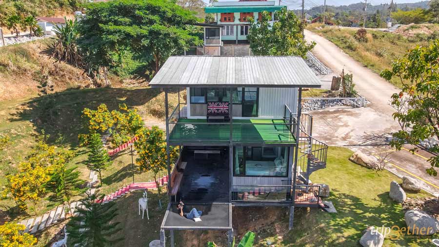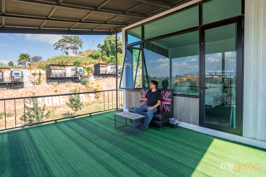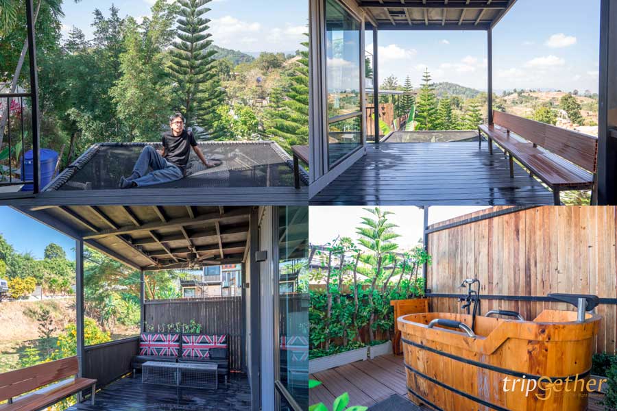ด้านนอกมีระเบียงให้นั่งชิลล์ๆ รับลม หรือถ้าอยากได้ฟีลพิเศษขึ้นไปอีก ก็สามารถเดินขึ้น ดาดฟ้าส่วนตัว เพื่อชมวิวธรรมชาติยามเย็น และนอนดูดาวในตอนกลางคืนจากมุมสูงแบบฟินๆ ได้เลยล่ะ