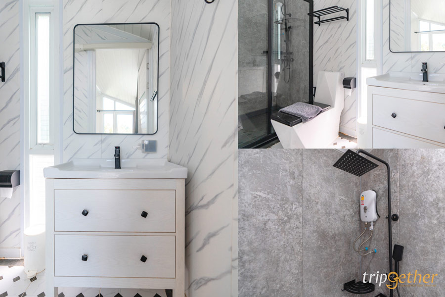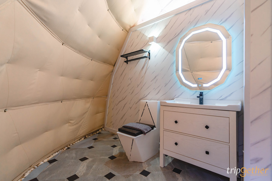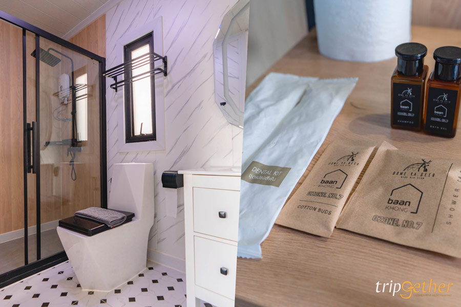 ภายในเต็นท์มี ห้องน้ำส่วนตัว แยกโซนเปียก – แห้งเป็นสัดส่วน ใช้งานสะดวกและเป็นส่วนตัว ด้านนอกมีทั้ง เปลตาข่าย สำหรับถ่ายรูปชิคๆ และชุดเก้าอี้ให้นั่งมองวิวช่วงเย็น รับลมเย็นๆ