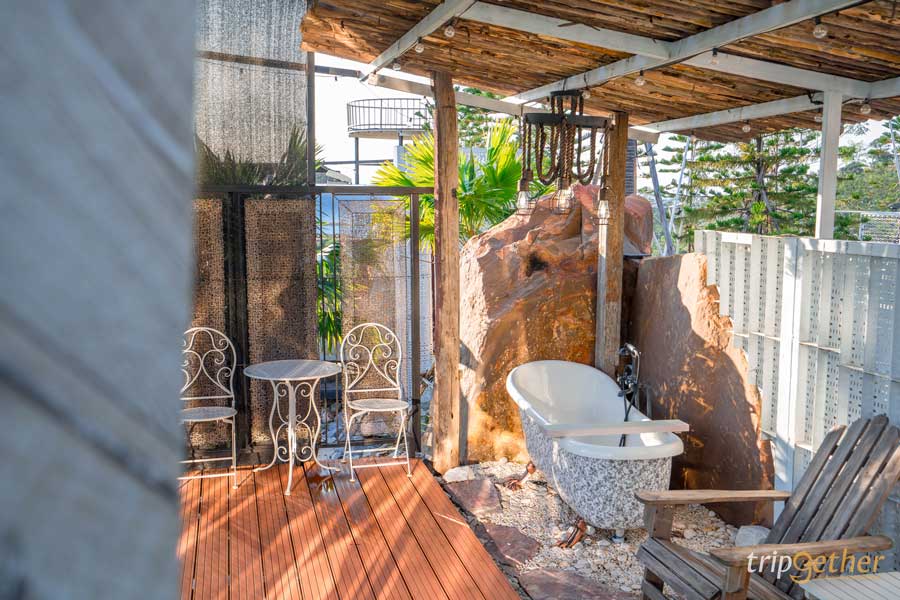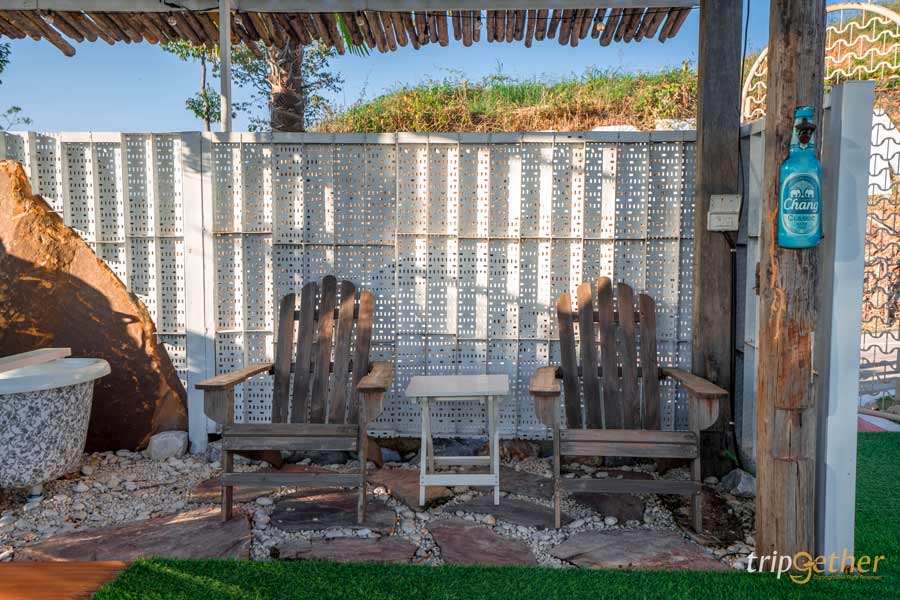 หน้าห้องพักยังมีซุ้มสำหรับนั่งพักผ่อนหรือทำกิจกรรมร่วมกัน เหมาะทั้งมาพักเป็นคู่ หรือมากับกลุ่มเพื่อน