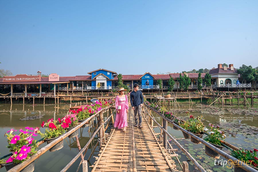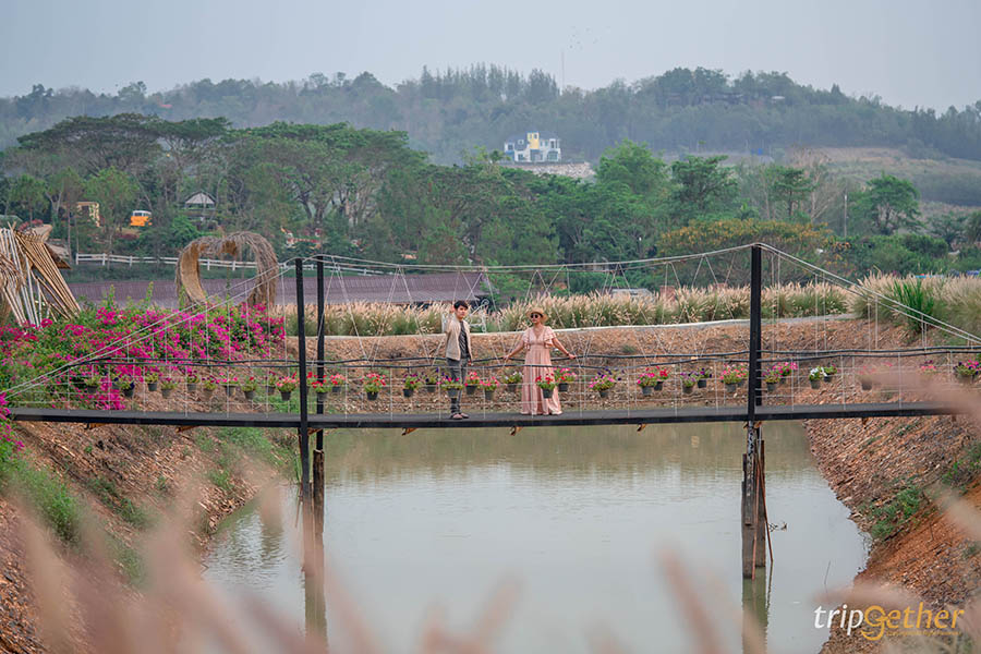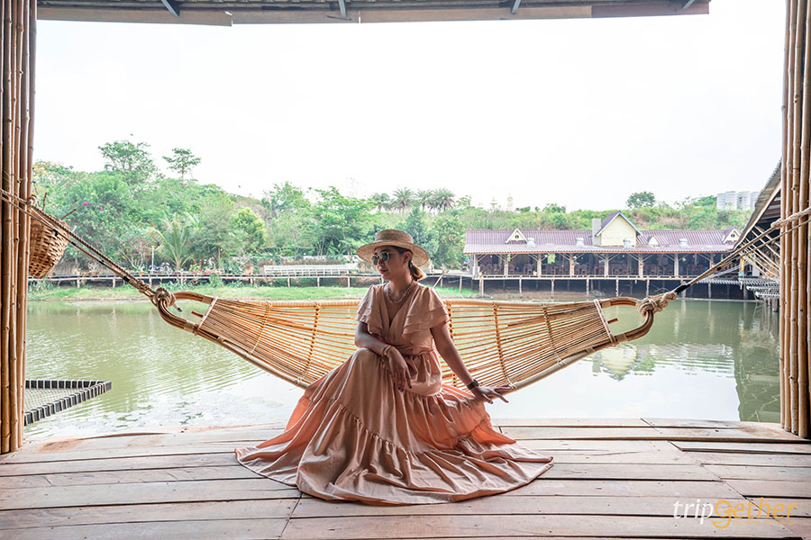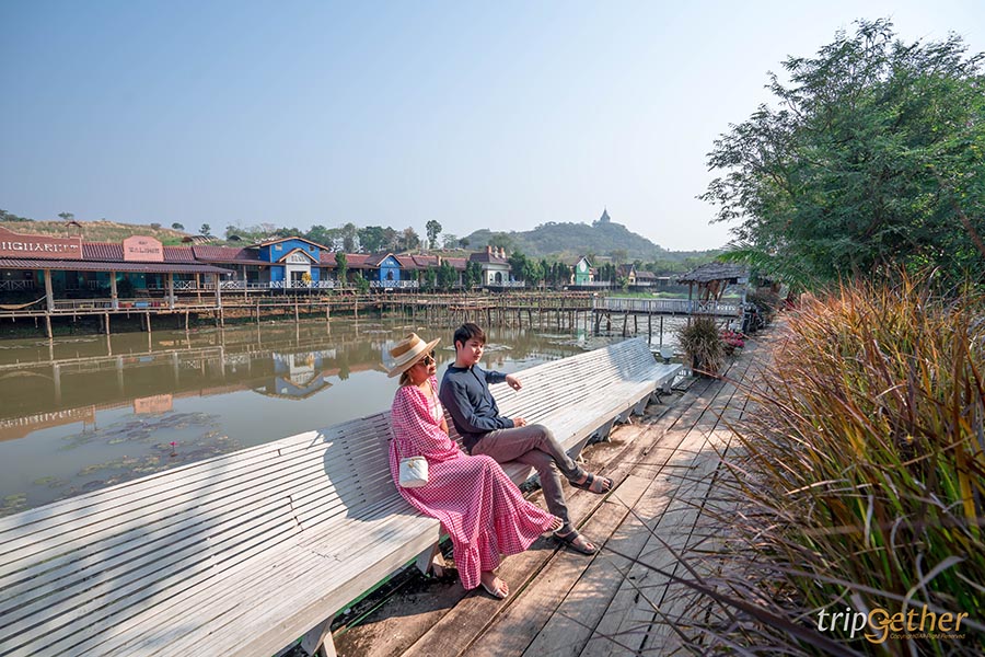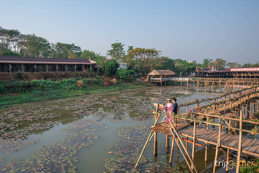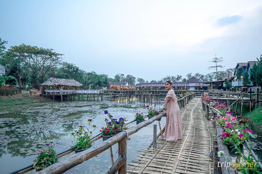 มุมถ่ายรูปอีกมุมที่พลาดไม่ได้เลยก็คือ มุมสะพานไม้ไผ่กลางสระน้ำ รับรองว่าได้รูปสวยๆ ไปลงโซเชียลเพียบ