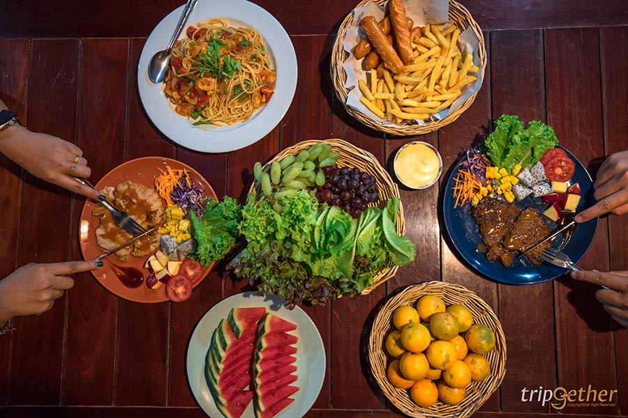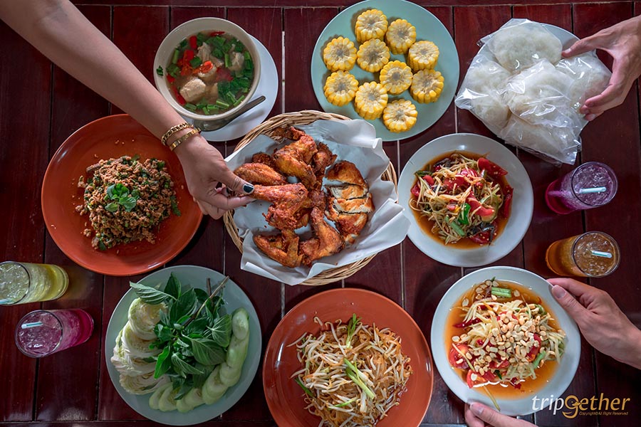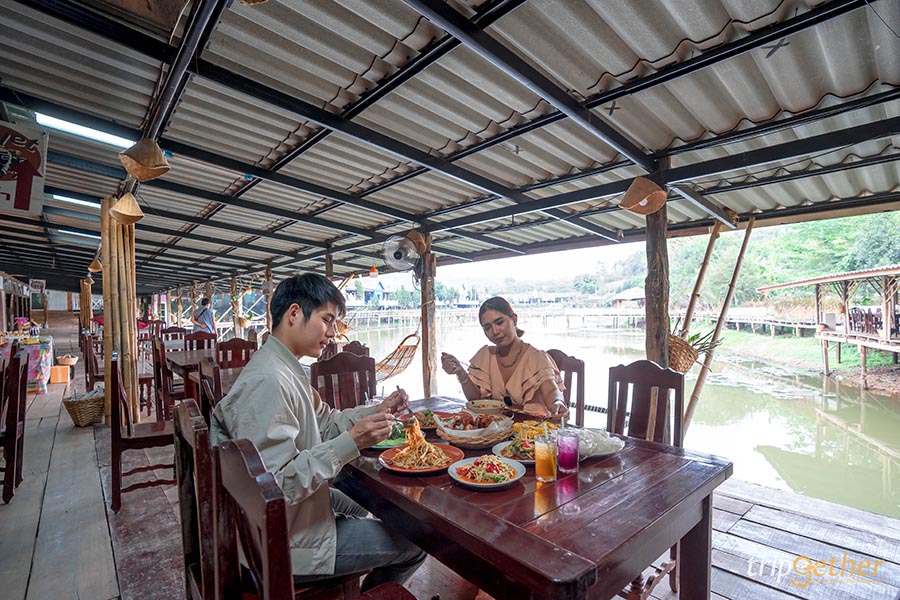 อาหารมื้อเที่ยง ของทางที่พักเป็นเมนูอาหารสไตล์ไทยๆ และอาหารอีสาน ไม่ว่าจะเป็น ส้มตำ ไก่ทอด ลาบอีสาน ผัดหมี่โคราช และต้มแซ่บ ที่พร้อมเสิร์ฟร้อนๆ เรียกได้ว่าใครที่เดินทางมาไกล ก็จะได้เติมพลังจนหายเหนื่อยกันเลยทีเดียว