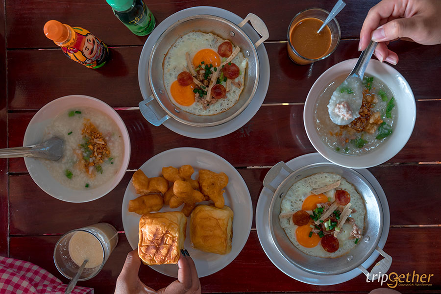 อาหารมื้อเช้า เป็นเมนูง่ายๆ อย่าง ข้าวต้มหมู ไข่กระทะ ปาท่องโก๋ ขนมปังปิ้ง และเครื่องดื่ม กาแฟ โอวัลติน