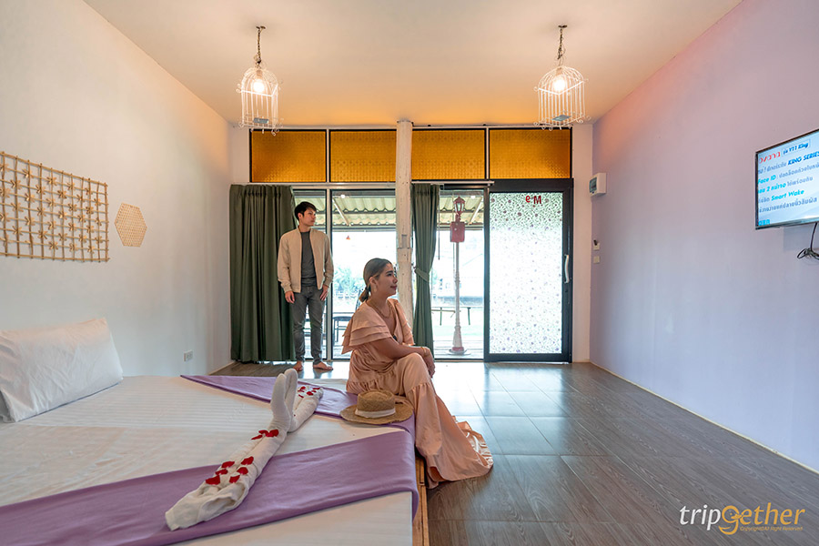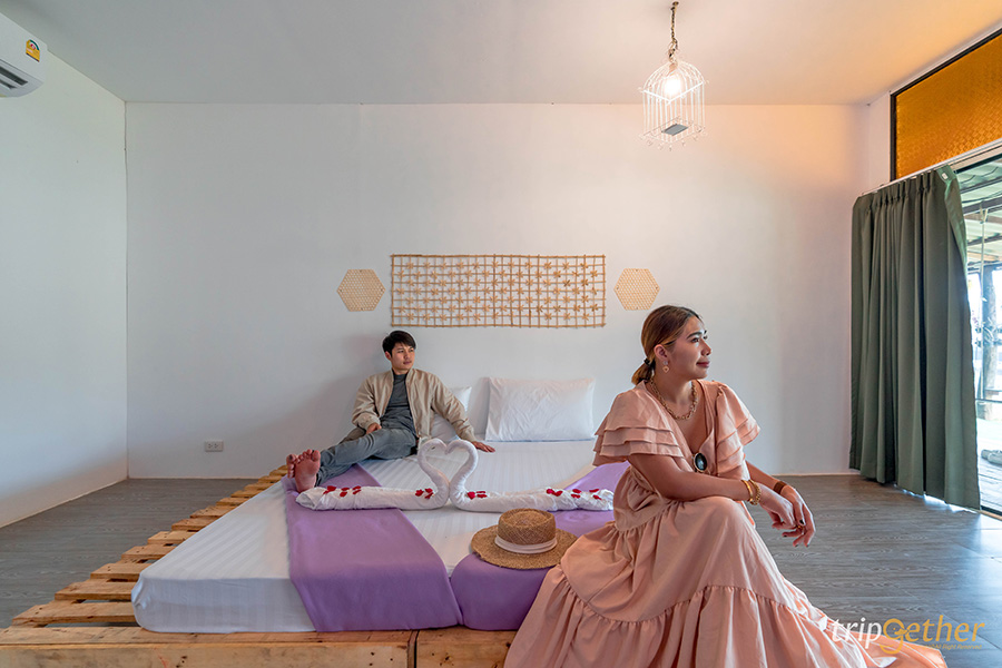 แนะนำ โซนคาเฟ่ มุมถ่ายรูป และอาหารทั้ง 3 มื้อกันไปแล้ว มาต่อกันที่ ห้องพักที่นอนคู่ ภายในห้องพักตกแต่งด้วยสไตล์เรียบง่ายให้อารมณ์วินเทจนิดๆ เน้นการพักผ่อนอย่างแท้จริง พื้นที่ภายในห้องพักกว้างขวางเพิ่มเติมสีสันให้ดูสดใสจากผนัง มาพร้อมสิ่งอำนวยความสะดวกไม่ว่าจะเป็น เครื่องปรับอากาศ ทีวี ผ้าขนหนู และน้ำดื่ม