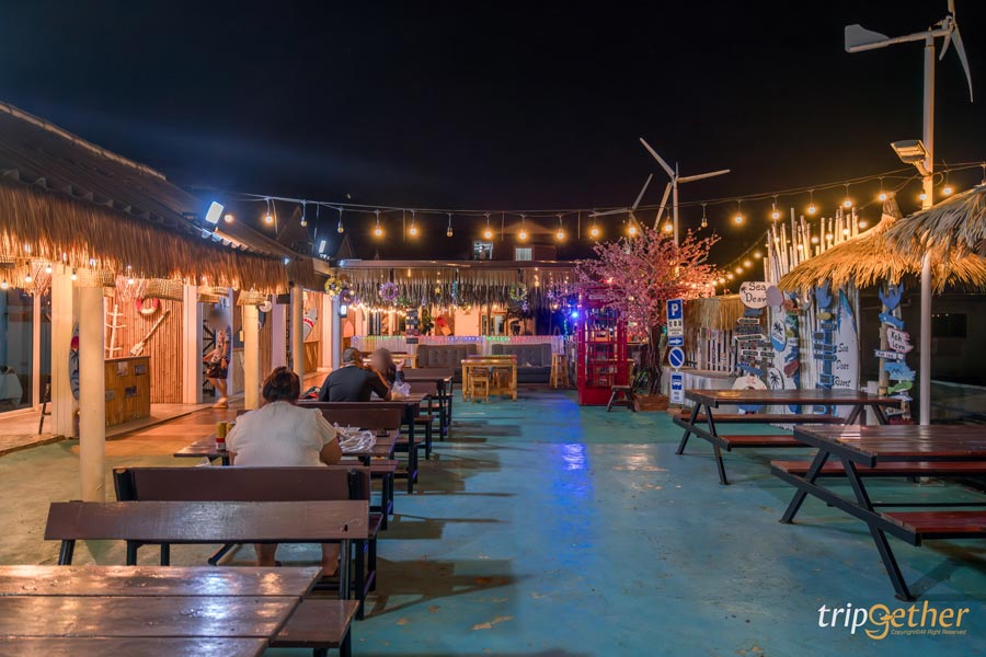 กลางคืนก็นั่งชิลล์รับลมทะเล ฟีลดีมาก มีไฟประดับสวยๆ บรรยากาศโรแมนติกแบบเกาะล้านแท้ๆ