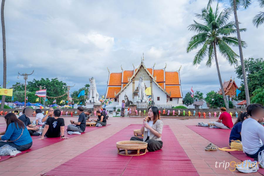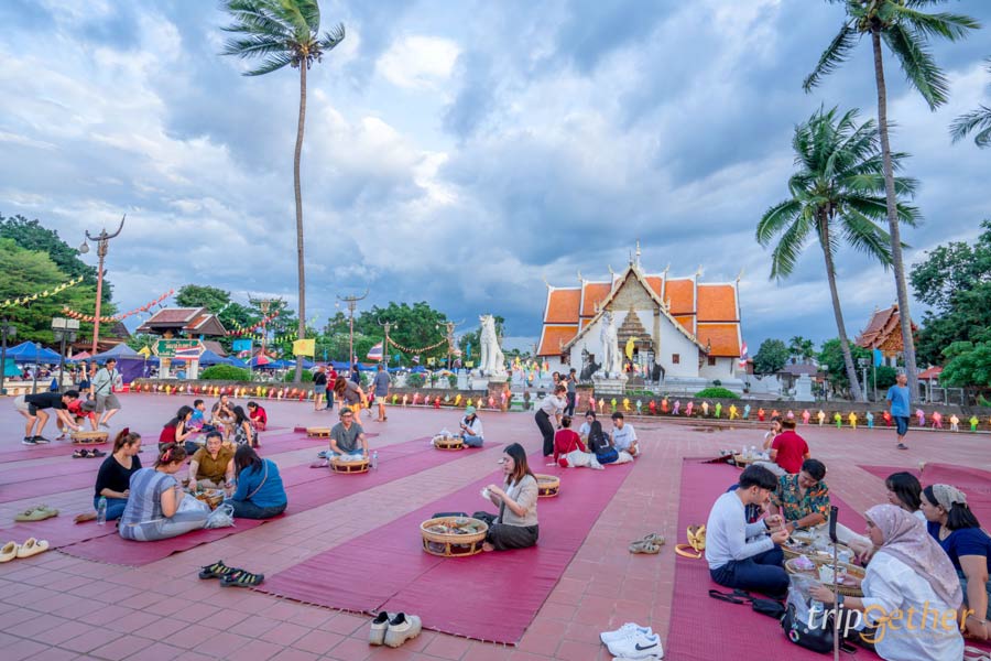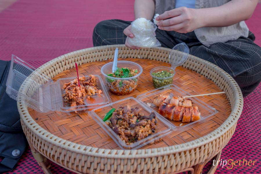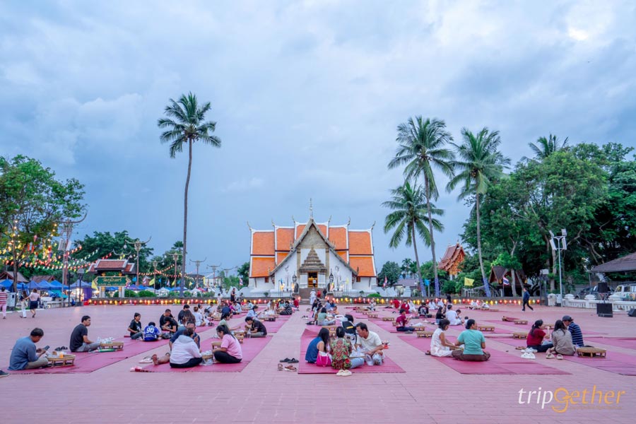 เสน่ห์อันเป็นเอกลักษณ์อีกอย่างของ กาดข่วงเมืองน่าน คือการเลือกซื้ออาหารแล้วมาจัดวางในขันโตกนั่งกินกันแบบชิลล์ๆ หน้าวัดภูมินทร์ บรรยากาศเหมือนได้ย้อนเวลากลับไปสัมผัสวัฒนธรรมล้านนาแท้ๆ