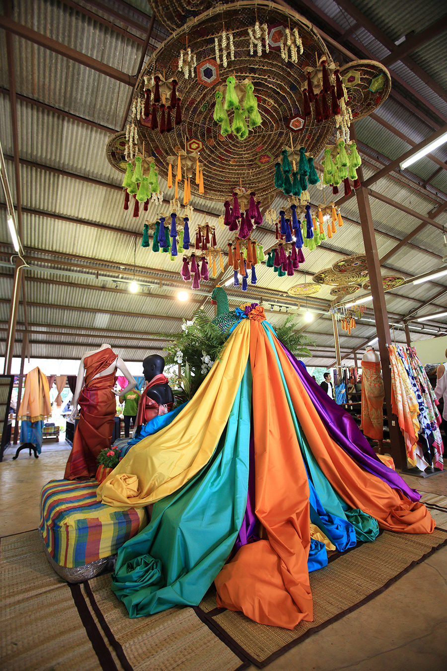 พบกับ “อุโมงค์ปลาหลากสี” ที่ผลิตจากผ้าหลากสีสันนำทางเข้าสู่หมู่บ้านจิม ชมกระบวนการย้อมเส้นไหมจากสีธรรมชาติและการทอผ้าไหม เรียนรู้และร่วมทดลองทุกขั้นตอนของกระบวนการผลิตผ้าไหมอันเลื่องชื่อและเป็นเอกลักษณ์ของ จิม ทอมป์สัน ตั้งแต่การสาวไหม การฟอกย้อมเส้นไหม การทอผ้าไหม และการพิมพ์ผ้าไหม