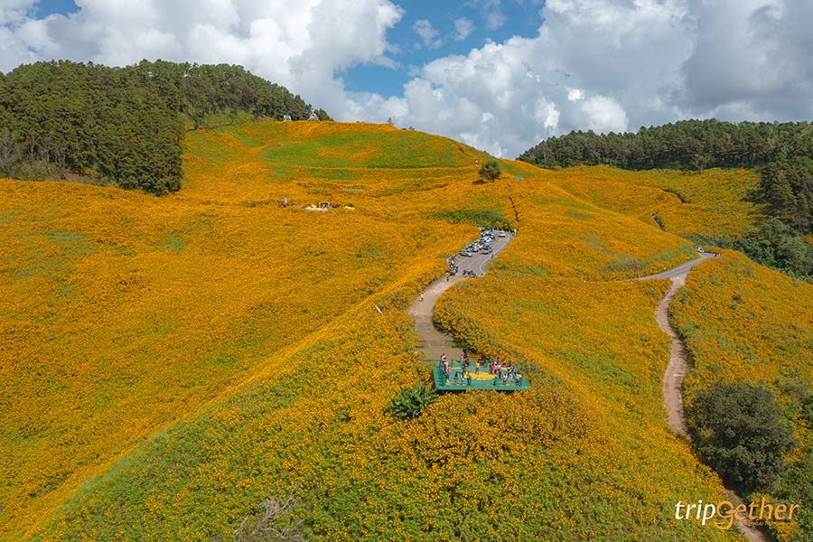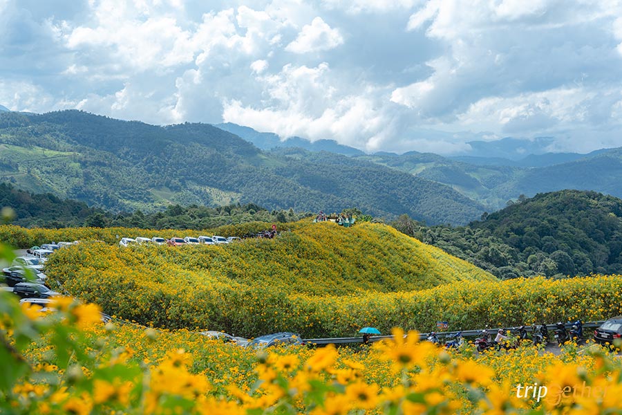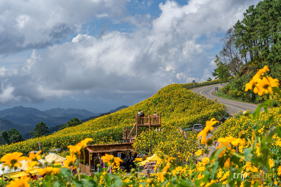 บนถนนก็เป็นอีกมุมที่นิยมมาถ่ายรูปกัน ฉากหลังเป็นทุ่งดอกบัวตองเหลืองแบบ 100%