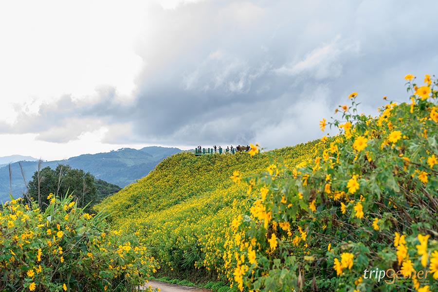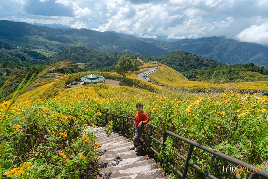 จุดชมวิวที่ทุ่งดอกบัวตองจะมีหลายจุด ทั้งกลางทุ่งดอกไม้และบนเนินสูง ซึ่งสามารถเห็นวิวได้แบบ 360 องศา แนะนำว่าให้ขึ้นมาถ่ายรูป รับรองได้รูปสวยอลังการกลับไปแน่นอน และหลังจากเดินถ่ายรูปกับเสร็จแล้ว ใครเหนื่อยก็สามารถแวะมาหาเครื่องดื่มเย็นๆ กันได้ ที่นี่จะมีร้านกาแฟเล็กๆ ให้เราได้นั่งพักผ่อนด้วย