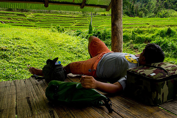 วิ่งหนีหลบฝน กระท่อมกลางนา นั่งพัก นอนพักชิวกันไป ฝนตกอากาศก็เย็น ชิวไปอีก แต่ไม่นานแดดก็ออก สลับกันไป พอเก็บภาพ VDO จนพอใจแล้วเราตัดสินใจรีบลง เพราะ กลัวมืด และกลัวฝนไล่ อาจเสี่ยงน้ำป่าอีกรอบ