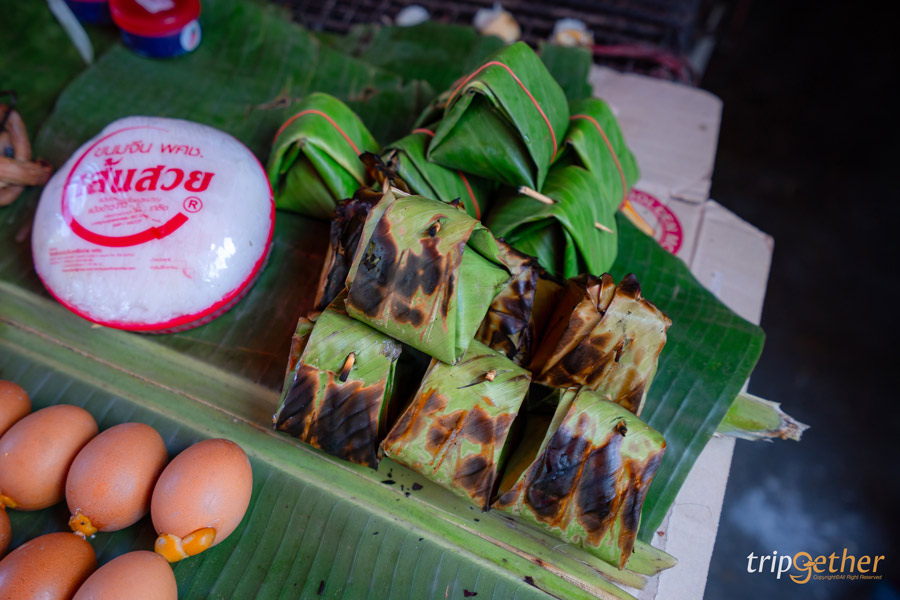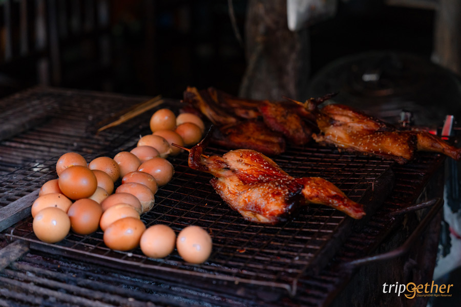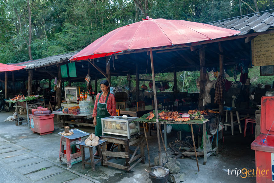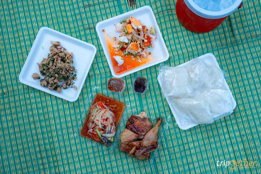 เมนูอาหารน่ากินมากกกมีส้มตำแซ่บๆ ไก่ย่างฉ่ำๆ กลิ่นหอมเตะจมูก ไข่ปิ้งก็มี ลาบหมูก็มา กินคู่กับข้าวเหนียวร้อนๆ คือสุขที่สุดของการเดินทาง