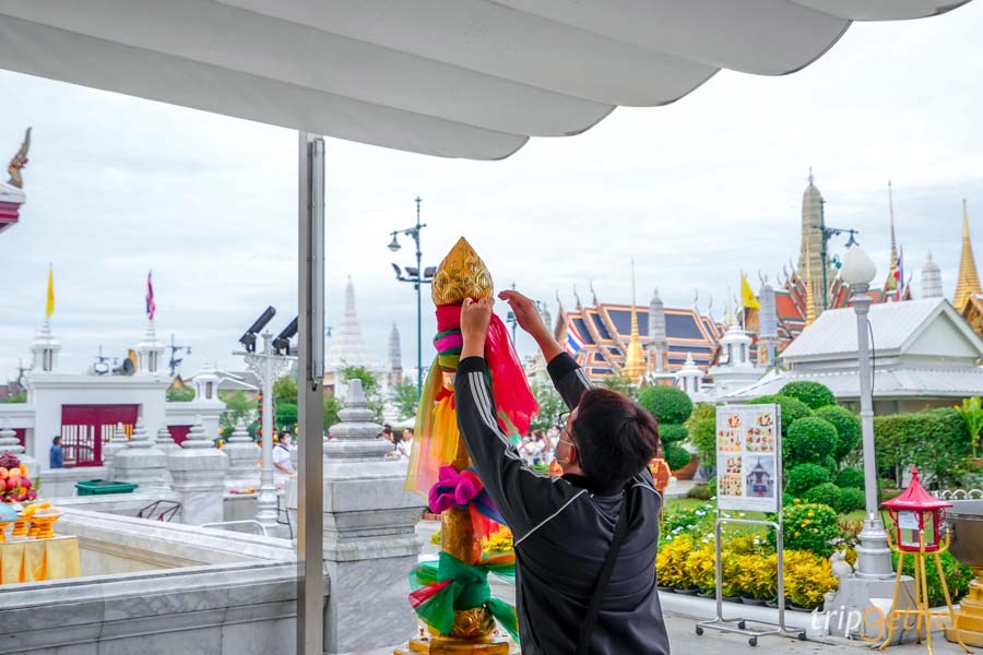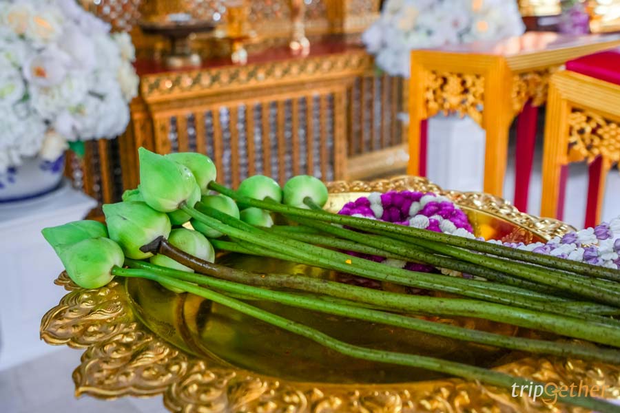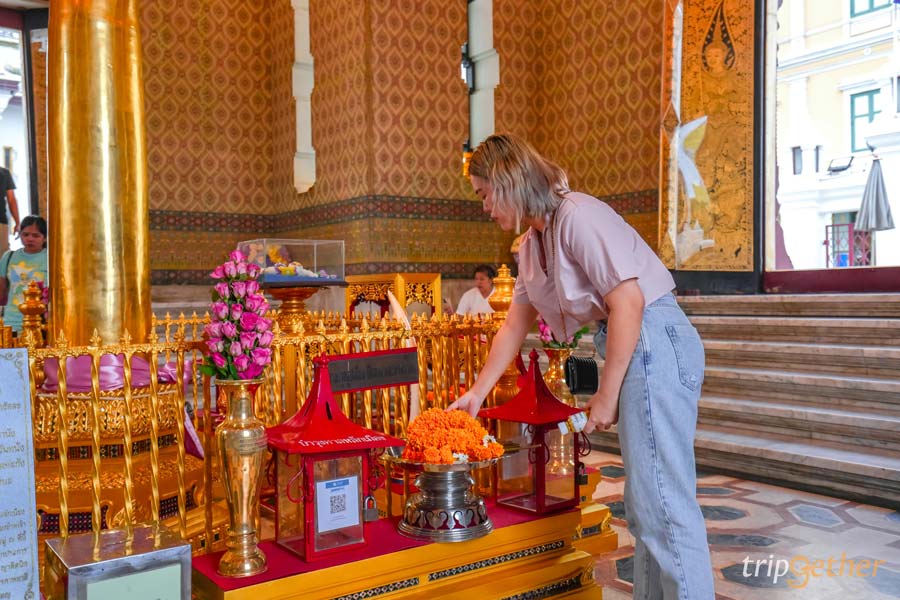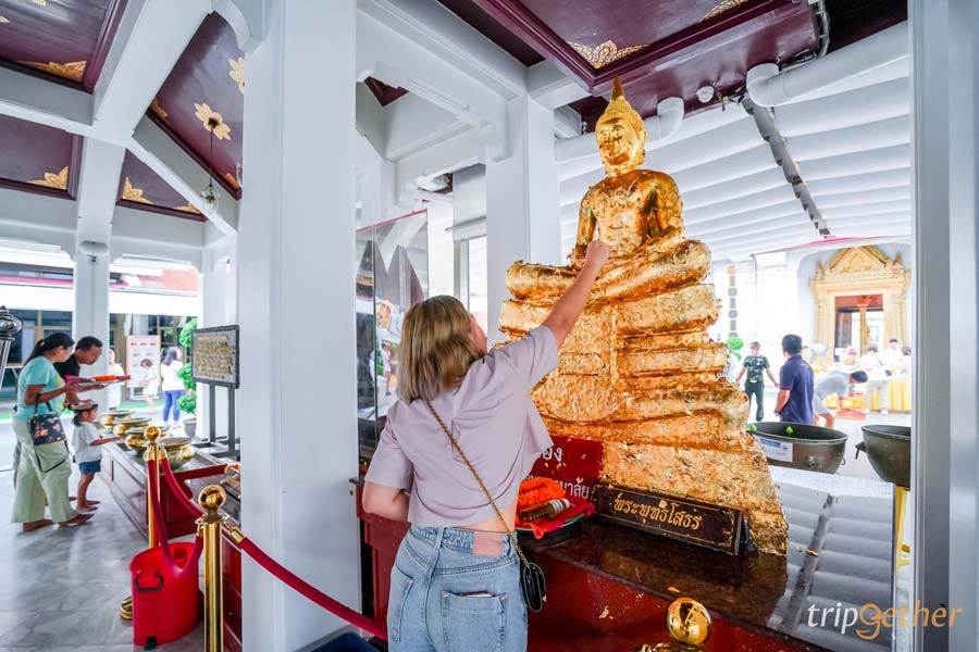 จุดที่ 1 หอพระพุทธรูป ถวายเป็นดอกบัว 1 ดอก นำไปสักการะพระพุทธรูป จากนั้นทำบุญใส่บาตรพระประจำวันเกิด ซึ่งเชื่อว่าเป็นการสะเดาะเคราะห์ และช่วยหนุนดวงเสริมความมั่นคงให้กับชีวิต