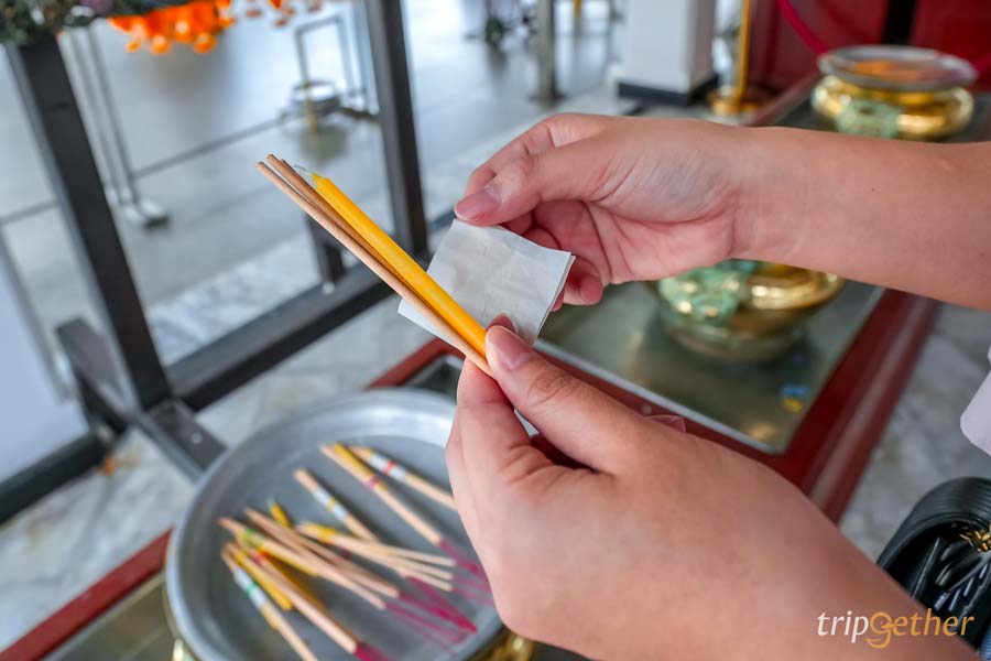หลังจากสวดคำบูชาสักการะองค์หลักเมืองเรียบร้อยแล้ว ให้นำธูป เทียนวางไว้ในถาด และอย่าลืมแกะใบทองคำเปลวออกมาด้วยนะ จุดนี้หลายๆ คนมักลืมสังเกตุ