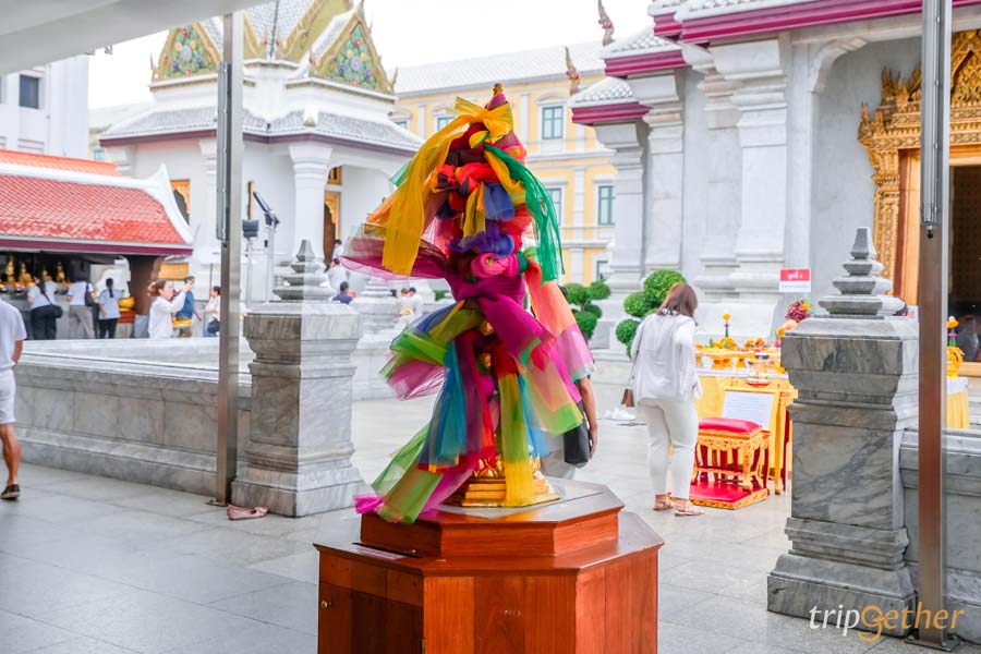 และนำผ้าแพรผูกไว้ที่ศาลหลักเมือง (องค์จำลอง) **ให้รวมผ้าทุกสีผูกไว้ที่เสาต้นเดียว ไม่ต้องแยกผ้าแพร