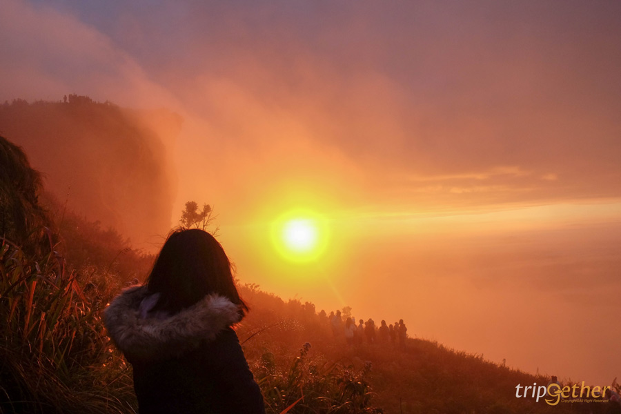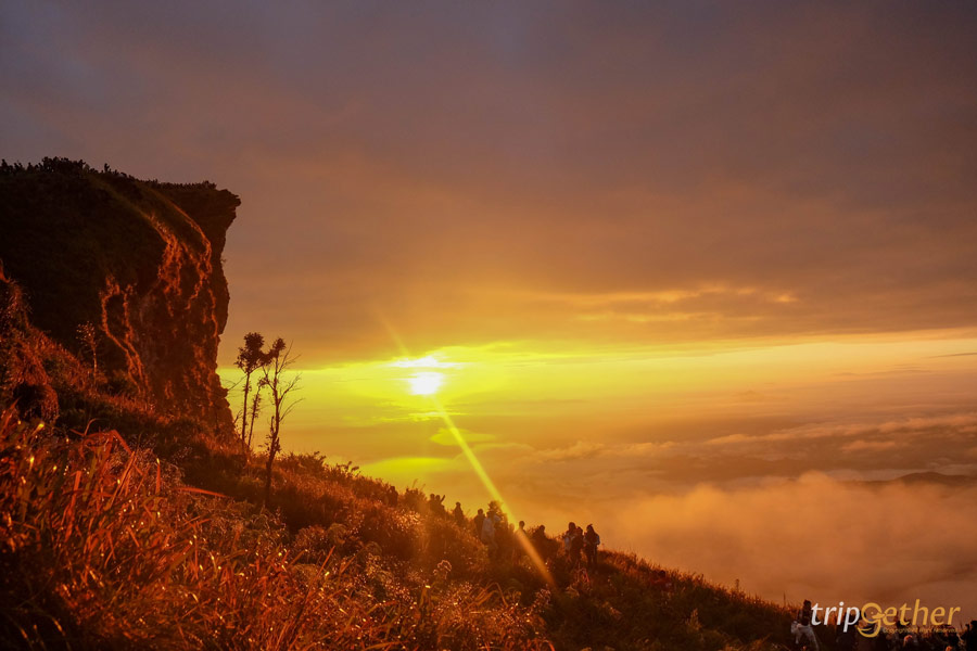 ไฮไลท์ที่ทำให้ใครๆ ตกหลุมรักภูชี้ฟ้า ต้องยกให้ จุดชมพระอาทิตย์ขึ้นและทะเลหมอกในยามเช้า ภาพที่เห็นตรงหน้า คือทะเลหมอกสีขาวฟุ้งที่ปกคลุมหุบเขาด้านล่าง ก่อนที่ดวงอาทิตย์จะค่อยๆ โผล่ขึ้นจากขอบฟ้า แสงสีทองสาดกระทบยอดเขาและทุ่งหญ้า บอกเลยว่าเป็นงดงามราวภาพวาด ในบางช่วงจะมี ดอกโคลงเคลง แซมอยู่ตามทางเดิน เพิ่มความละมุนให้กับวิวตรงหน้าอย่างลงตัว