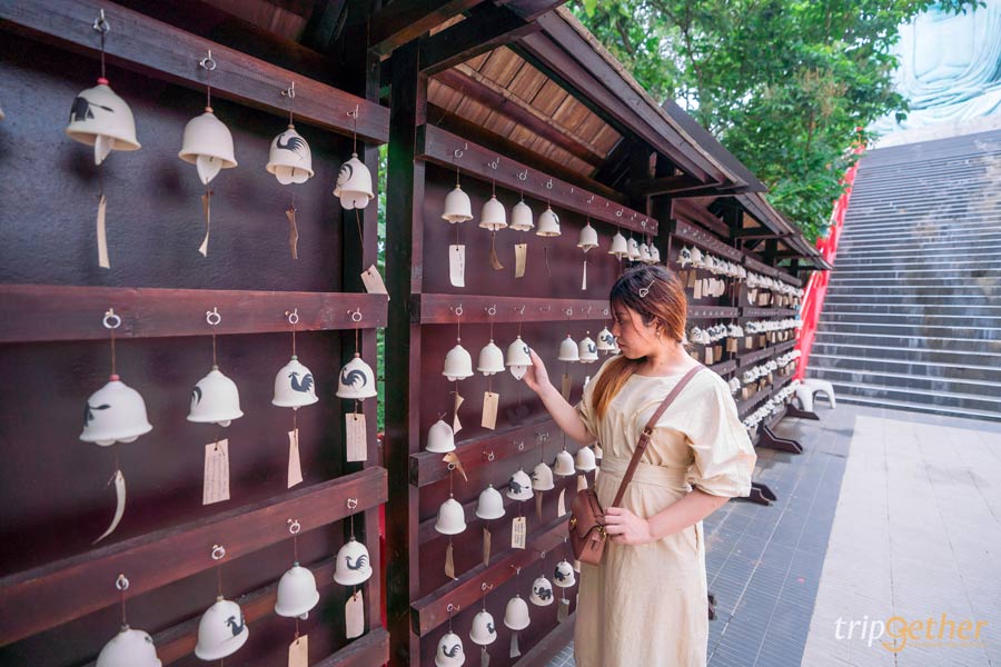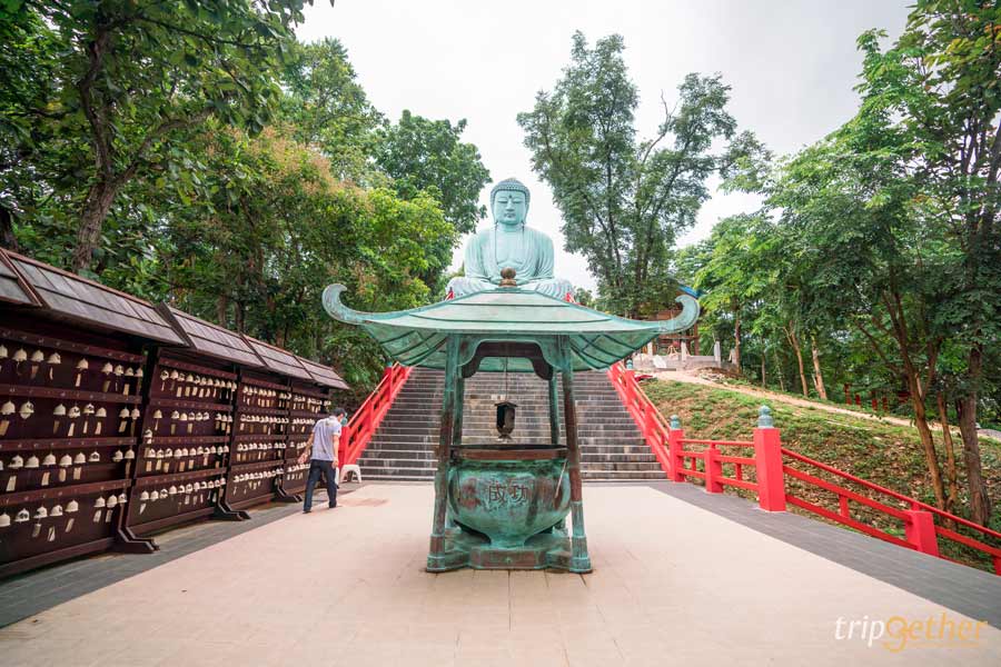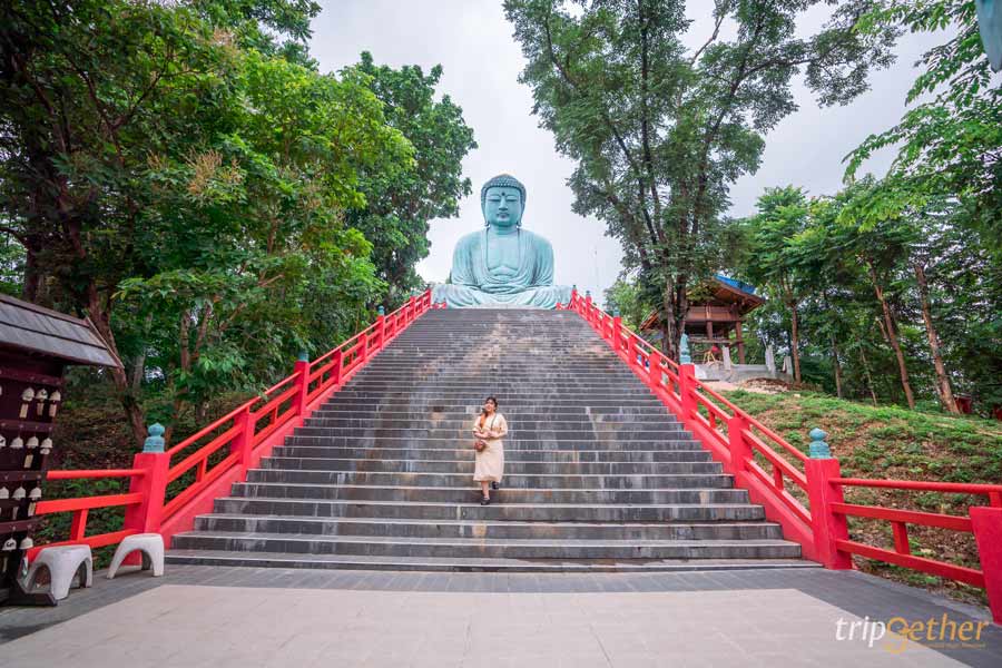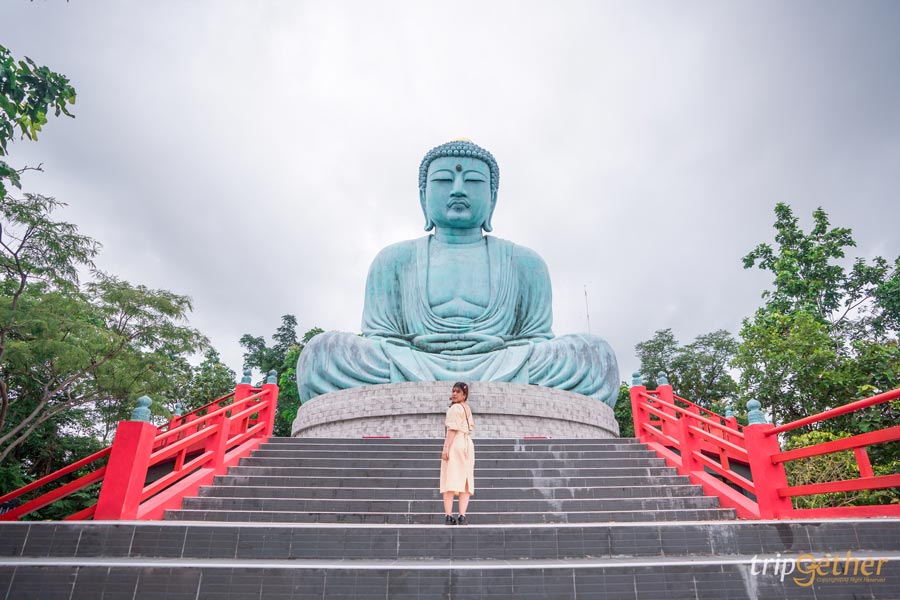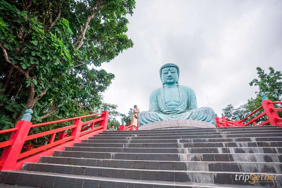 องค์พระใหญ่ไดบุตสึ พระอมิตาภพุทธะ พระองค์ใหญ่สีเขียวอมฟ้า จำลองมาจากวัดโคโตคุอิน (Kotokuin Temple) เมืองคามารุคะ ประเทศญี่ปุ่น ขนาดหน้าตัก 14 เมตร สูง 23 เมตร สร้างด้วยเทคนิคงานเคาะโลหะขึ้นรูปด้วยมือ ตั้งตระหง่านสวยงามเป็นสง่า เรายืนข้างๆ ฐานองค์พระ รู้สึกได้ถึงขนาดองค์พระที่มีขนาดใหญ่โตน่าเกรงขาม ดูมีมนต์ขลัง ได้ฟีลเหมือนไปวัดที่ญี่ปุ่นเลย ไม่พลาดที่จะไหว้พระขอพรองค์พระใหญ่ไดบุตสึ และเก็บภาพสวยๆ บรรยากาศวัดญี่ปุ่นสักหน่อย