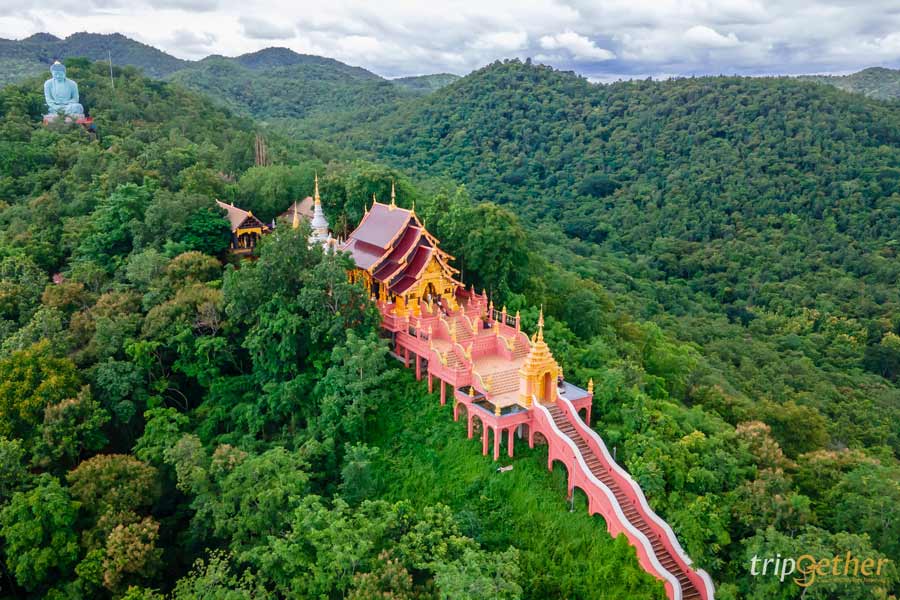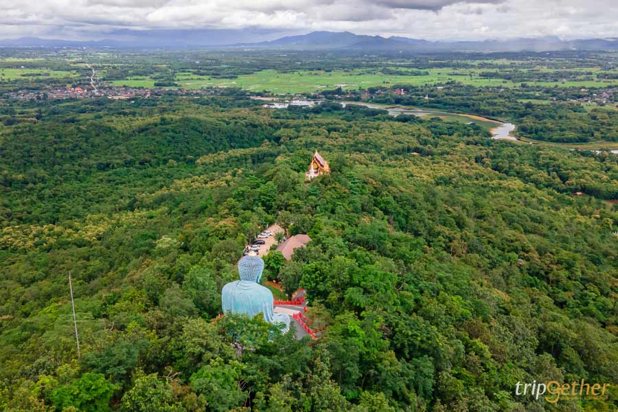 ก่อนกลับขอแวะเก็บภาพวัดจากมุมโดรนสักหน่อย เราจะเห็นว่าองค์พระใหญ่ไดบุตสึ สร้างอยู่บนยอดดอยสูง รายล้อมด้วยขุนเขาต้นไม้สีเขียวโดดเด่นเป็นสง่ากลางดอยพระฌาน สมกับเป็นวัดบนดอยสูงจริงๆ เลยล่ะ