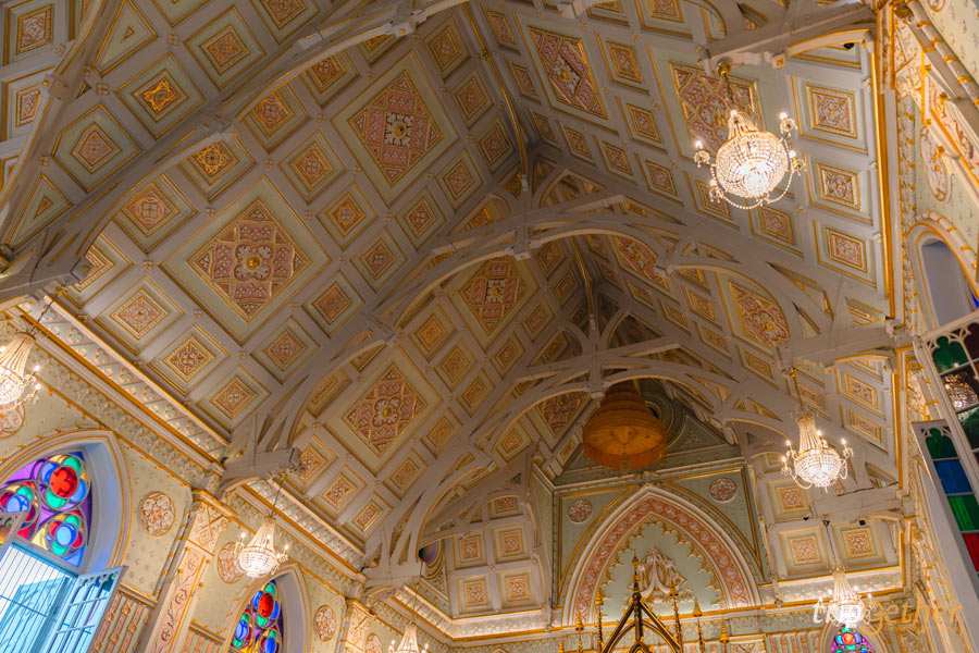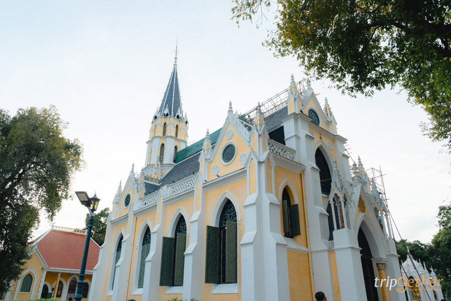 ซุ้มประตูและหน้าต่างออกเแบบเป็นอาร์กโค้งแบบยุโรป ด้านท้ายของอุโบสถเป็นโดมสูงที่มียอดแหลมเสียดฟ้า ไม่ว่าจะมุมไหนก็สวยงามไปทั้งหมด