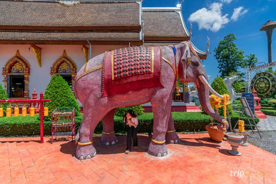 ก่อนกลับแนะนำให้ลอดใต้ท้องช้างเพื่อเป็นสิริมงคล ซึ่งเป็น ช้างคู่เผือกคู่บารมี ขององค์พระใหญ่ ด้านขวาชื่อพลายทวีทรัพย์ ส่วนทางด้านซ้ายชื่อพลายมงคลเเสนล้าน ส่วนระหว่างกลางของช้างเผือกทั้งสองเชือก นั้นจะมีพระแม่ธรณีบีบมวยผม เป็นสัญลักษณ์แห่งความอุดมสมบูรณ์