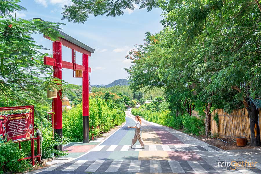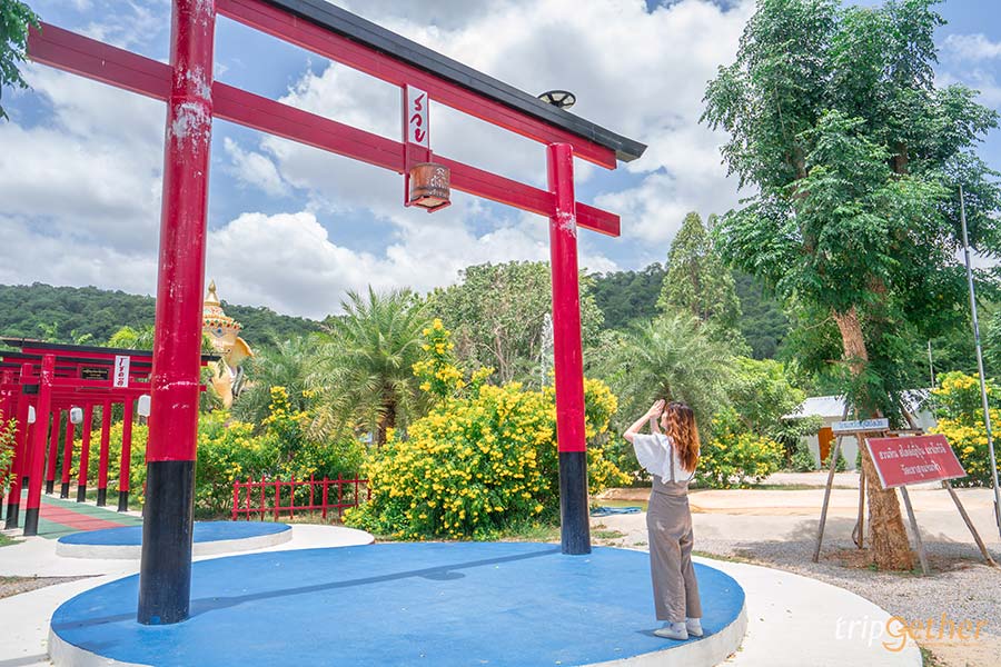 หลังจากเดินทำบุญกันเสร็จแล้วก็เดินมาหามุมถ่ายรูปสวยๆ กันบ้าง ในวัดมีมุมให้ได้ถ่ายรูปเช็คอินมากมาย เริ่มจากเดินข้ามถนนสายรุ้งมาถ่ายรูปสวยสไตล์ญี่ปุ่นที่เสาโทริอิสีแดงสดใส ทางเดินเสาโทริอิจำนวน 88 ต้น ตั้งเรียงรายกลางธรรมชาติ ฟีลตรงนี้เหมือนอยู่ที่ญี่ปุ่นจริงๆ นอกจากนี้ยังมีถังน้ำเสี่ยงทาย โดยให้เราถือเหรียญไว้ในมือแล้วอธิษฐานขอพร (ส่วนใหญ่จะขอเรื่องความร่ำรวย) หลังจากนั้นก็โยนเหรียญให้ลงถัง เชื่อกันว่าถ้าใครสามารถโยนเหรียญลงถังได้สำเร็จ พรที่เราขอก็จะประสบผลตามนั้น