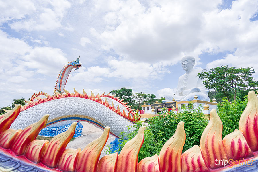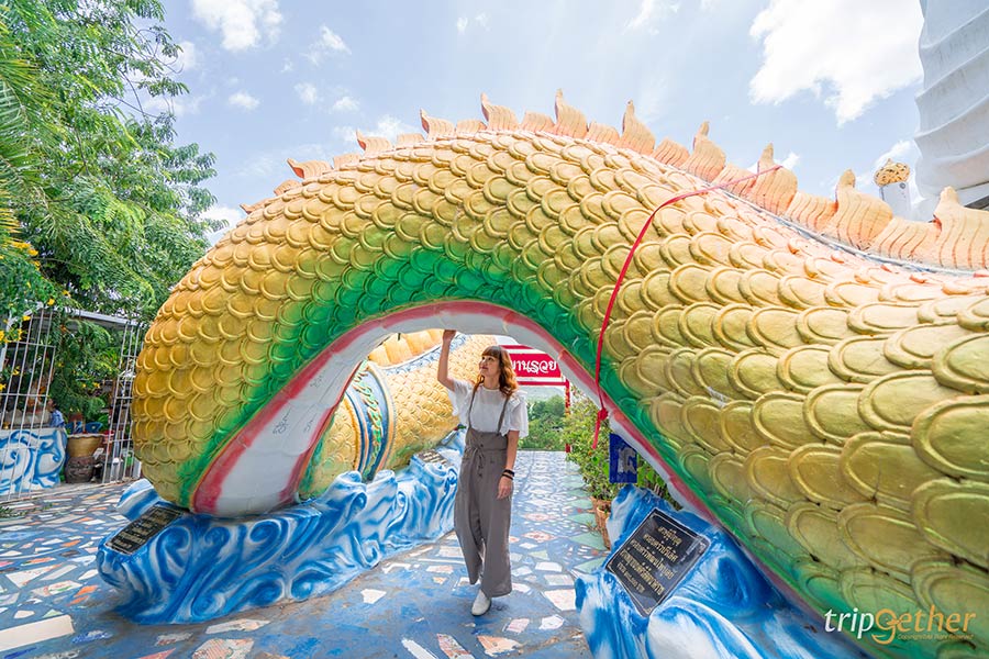 เช็คอินกันต่อที่องค์พญานาคราชองค์ใหญ่ที่อยู่ท่ามกลางสวนสีเขียวที่มีฉากหลังเป็นอุโบสถสีขาว ถือว่าเป็นภาพที่ยิ่งใหญ่และงดงามอย่างมาก สำหรับบริเวณนี้เป็นสวนร่มรื่นให้ได้เดินสบายๆ ชมความสวยงามขององค์พญานาค รวมถึงยังมีจุดให้ได้ไหว้ อย่างพระราหูองค์ใหญ่ มากราบขอพระและสะเดาะห์เคราะห์ หรือจะมาเสริมสิริมงคลด้วยการเดินลอดใต้ท้องพญานาคทั้ง 10 จุด