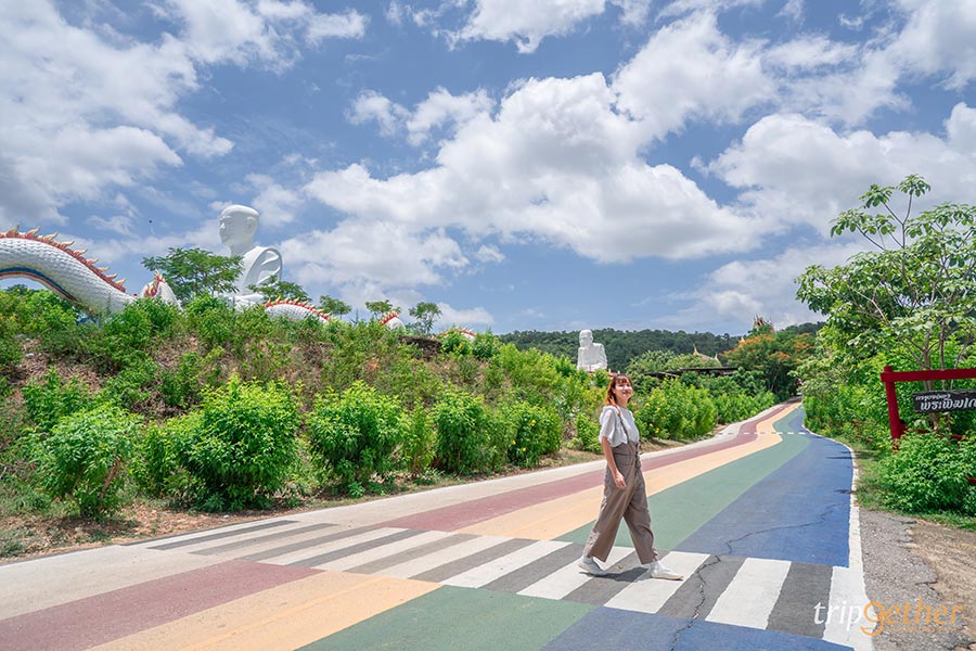 และสุดท้ายมาเช็คอินถนนสายรุ้ง เป็นถนนที่จะพาเราขับรถขึ้นเนินไปยังตัววัดด้านบน บนถนนถูกทาด้วยสีสันสดใสและมีทางม้าลายเล็กให้ได้เดินถ่ายรูปขณะข้ามถนน พร้อมด้วยวิวสองข้างทางเป็นต้นไม้สีเขียว บอกเลยว่าถ่ายรูปเริ่ดไม่ไหว! สำหรับการมาวัดเขาสูงแจ่มฟ้า ทำให้เราได้ทำบุญจากสิ่งศักดิ์สิทธิ์หลายๆ องค์ รวมถึงได้รูปสวยกลับไปอัปลงโซเชียลอีกมากมาย และยังเป็นวัดที่มีเนื้อที่กว้างมาก ดังนั้นใครที่มาอาจจะต้องเผื่อเวลาเดินกันสักหน่อย เอาเป็นว่าใครที่มาเที่ยวกาญจนบุรี ให้เพิ่มวัดเขาสูงแจ่มฟ้าอยู่ในลิสต์แลนด์มาร์กที่ต้องมาเช็คอินเลย