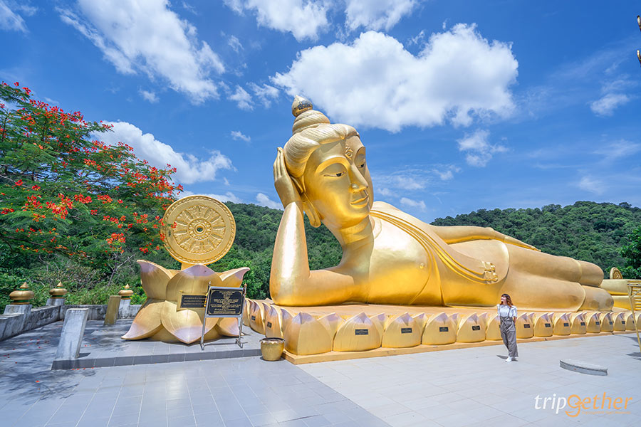 พระพุทธรูปปางไสยาสน์องค์ใหญ่ นอนท่ามกลางธรรมชาติ มีภูเขาลูกใหญ่เป็นฉากหลัง บอกเลยว่าดูสวยยิ่งใหญ่มาก