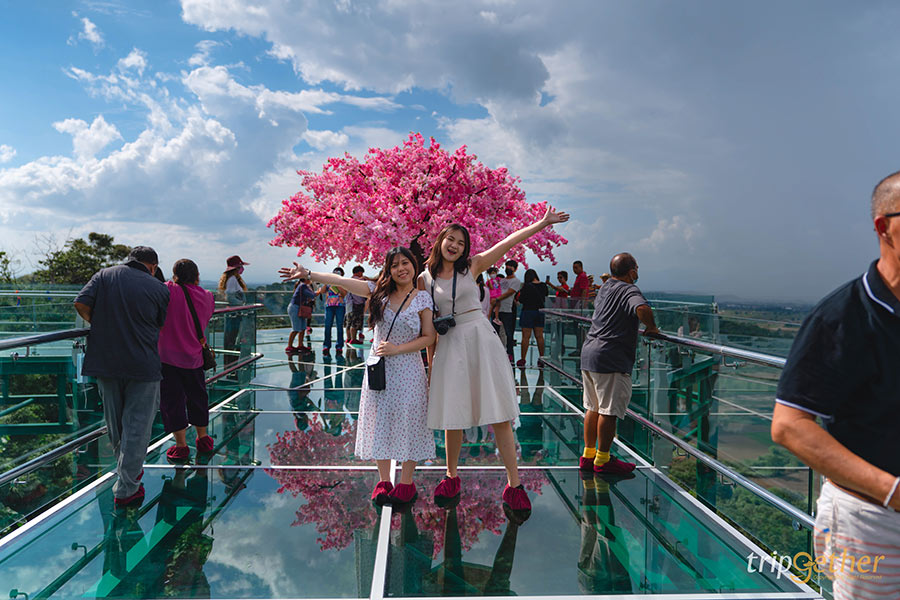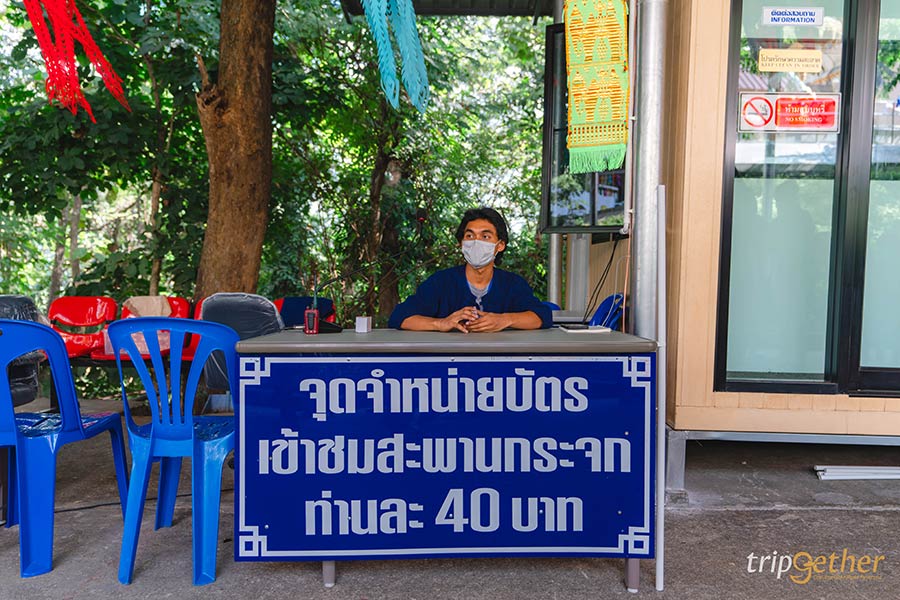 ก่อนที่จะขึ้นสกายวอล์คจะต้องซื้อบัตรเข้าชม 40 บาท/คน ซึ่งเราจะนำบัตรนี้ไปแลกเป็นรองเท้าสำหรับเดินขึ้นสกายวอล์ค นอกจากนี้ที่สกายวอล์คยังมีกิมมิคน่ารักๆ เอาใจสายมูอย่าง โบว์อธิษฐาน ราคา 30 บาท/เส้น เพื่อนำไปผูกรอบพระธาตุหรือผูกบนราวสกายวอล์ค โดยโบว์นี้จะมีหลายสีและคำขอพรที่ต่างกันไป ใครต้องการเสริมดวงด้านไหนก็ต้องจัดสักเส้นแล้ว