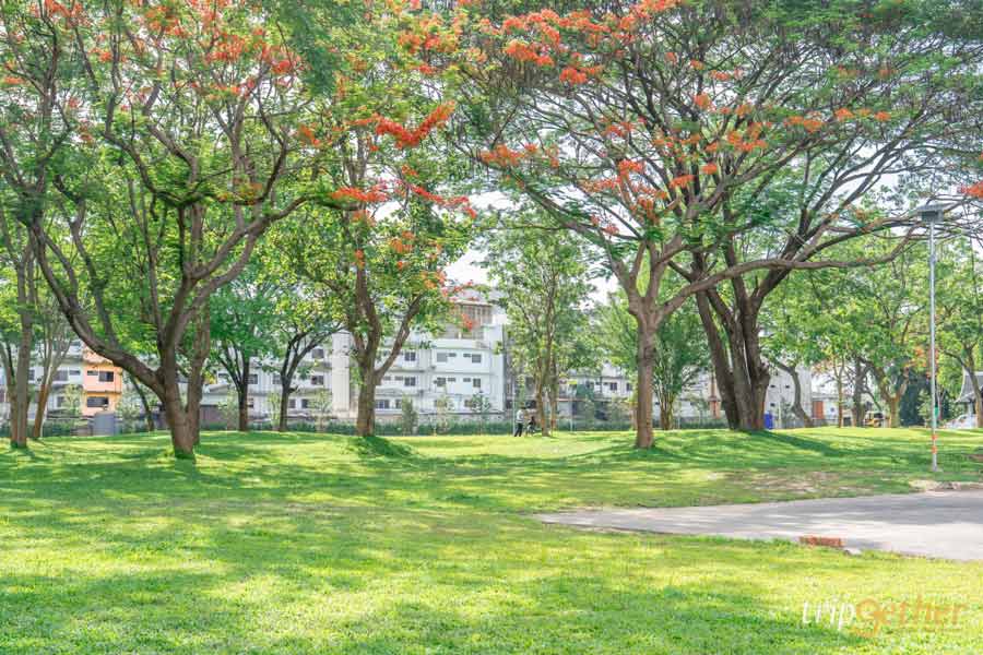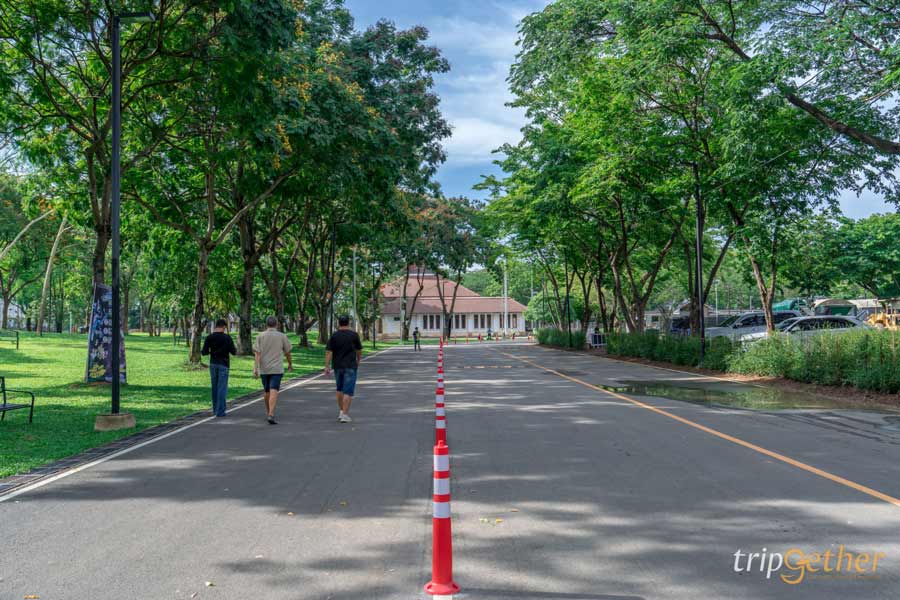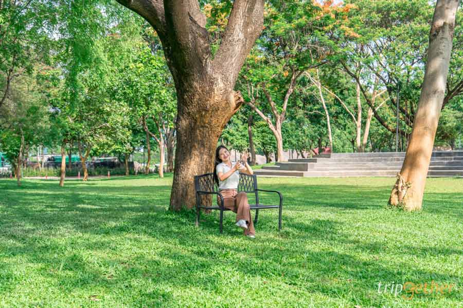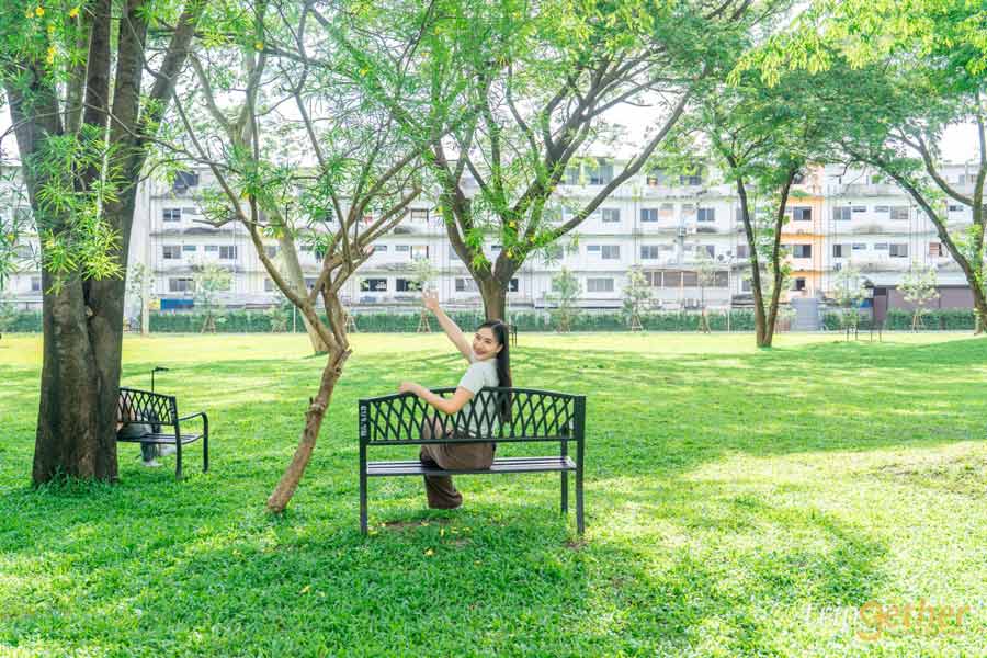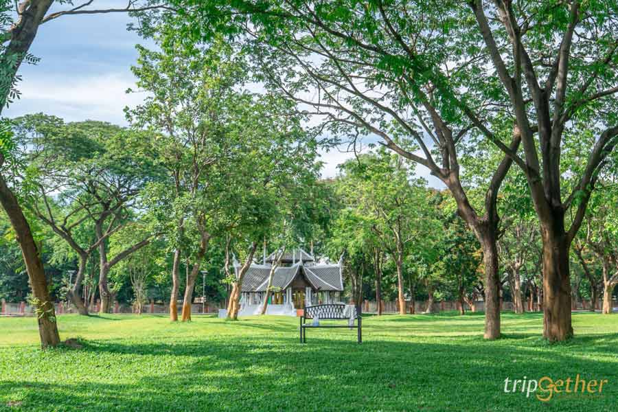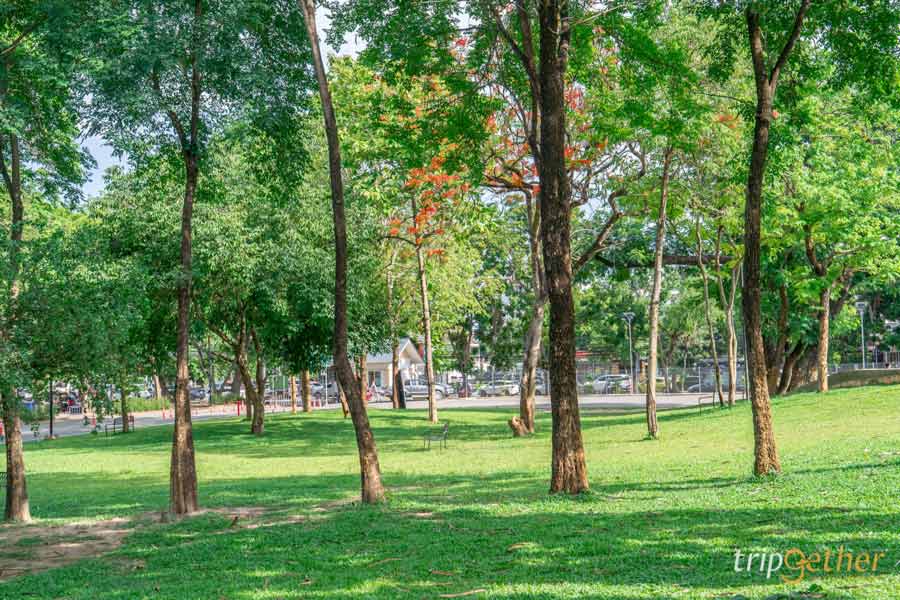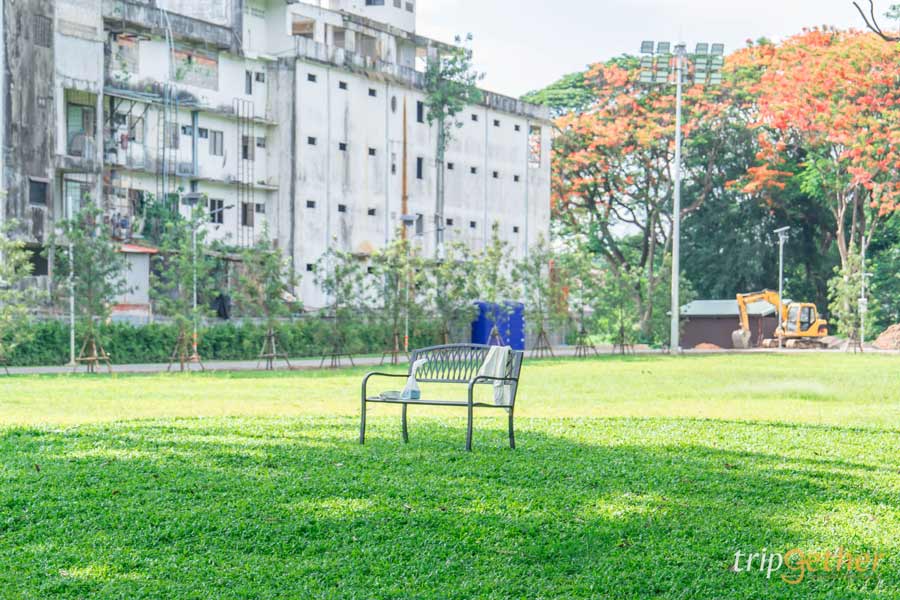 ไม่ว่าจะมองไปทางไหนก็เห็นความเขียวขจีของต้นไม้ใหญ่และลานหญ้ากว้างสุดลูกหูลูกตา เหมาะกับการมาปิกนิก นั่งเล่นชิลล์ๆ หรือเดินเล่นรับลมยามเย็น บอกเลยว่าบรรยากาศดีจนอยากกลับมาซ้ำ