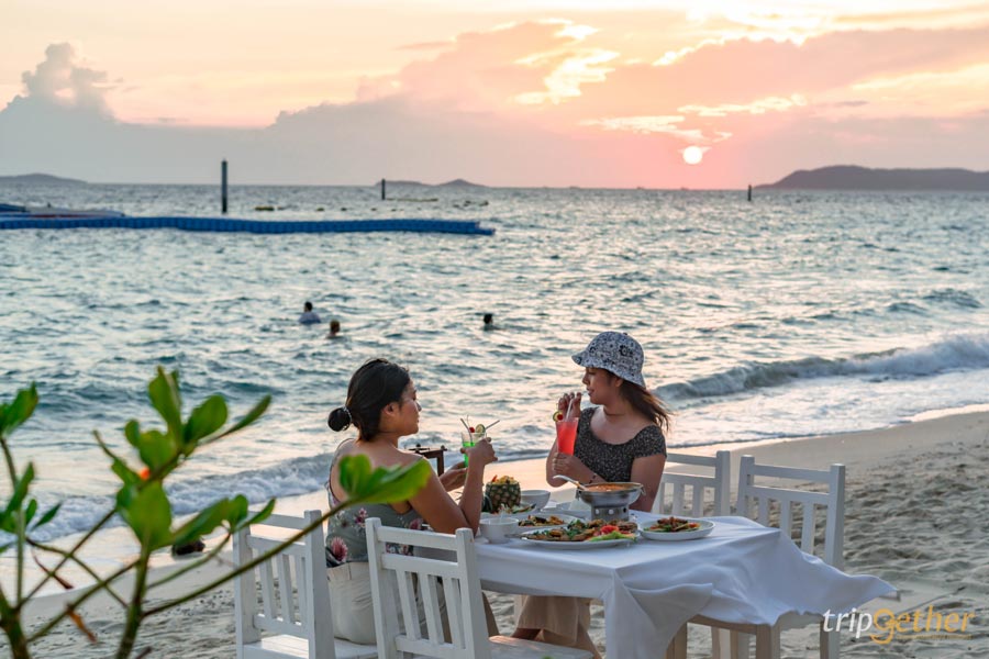 สำหรับ หาดแสม เกาะล้าน บอกเลยว่าไม่ได้มีดีแค่การมานั่งดูพระอาทิตย์หรือเล่นน้ำทะเลเท่านั้น ใกล้ๆ ชายหาดยังมีคาเฟ่น่ารักๆ ร้านอาหารอร่อยๆ บรรยากาศดี มากับเพื่อนก็สนุกอบอุ่น มากับหวานใจก็สุดจะโรแมนติก หลังจากดูพระอาทิตย์ตก กินลมชมวิวกันเต็มอิ่มแล้วก็แวะมานั่งดินเนอร์รับลมทะเลกันต่อได้เลย