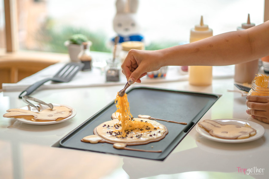 แพนเค้กสุกแล้วเราก็โรยท็อปปิ้งได้ตามชอบ