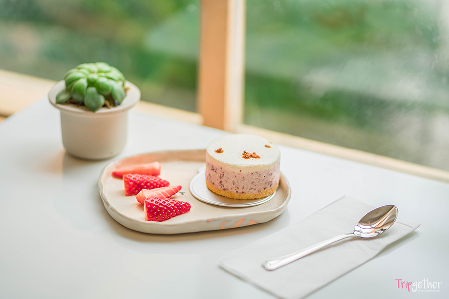 ต่อด้วย Miffy Budou cheese pie เมนูชีสพายที่ให้รสเปรี้ยวๆ ของบลูเบอร์รี่ตัดกับรสเค็มของชีสได้อย่างลงตัว เพิ่มความกรุบกรอบด้วยตัวแครกเกอร์ที่อัดมาด้านล่างกินพร้อมกันอร่อยลงตัวทีเดียว