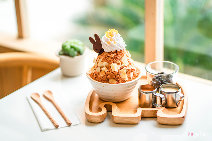 ต่อด้วยเมนูใหม่ที่แนะนำว่าต้องลอง Thai tea Kakigori เมนูบิงซูชาไทยที่ยังคงคอนเซ็ปต์ความน่ารักสไตล์มิฟฟี่ เสิร์ฟมาพร้อมท็อปปิ้งให้เราได้ใส่เพิ่มตามสไตล์ไม่ว่าจะเป็นซอสชาไทย ซอสนมข้นหวาน และเม็ดไข่มุก โรยหน้าด้วยแผ่นอัลมอลด์สไลด์ที่เพิ่มความมันระหว่างรับประทาน