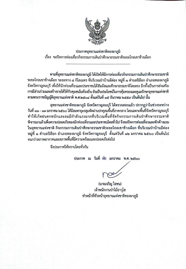 อุทยานแห่งชาติทองผาภูมิ จังหวัดกาญจนบุรี ได้เปิดให้มีการท่องเที่ยวกิจกรรมการเดินป่าศึกษาธรรมชาติระยะไกลเขาช้างเผือก ตั้งแต่วันที่ 15 ธันวาคม 2559 เป็นต้นไป แต่เนื่องด้วยวันที่ 11-12 มกราคม 2560 ได้มีลมมรสุมพัดผ่านปกคลุมพื้นที่ภาคกลาง โดยเฉพาะพื้นที่จังหวัดกาญจนบุรี ทำให้เกิดฝนตกหนักและลมมีกำลังแรงมากที่บริเวณพื้นที่จัดกิจกรรมการเดินป่าศึกษาธรรมชาติ ทางอุทยานจึงขอยกเลิกการท่องเที่ยว พักค้างแรม และกิจกรรมเดินป่าศึกษาธรรมชาติระยะไกลเขาช้างเผือก ในช่วงวันที่ 13-15 มกราคม 2560 หรือจนกว่าสภาพอากาศ สภาพพื้นที่จะมีความพร้อมและปลอดภัยต่อไป ทั้งนี้สามารถโทรสอบถามได้ที่เบอร์ 034510979