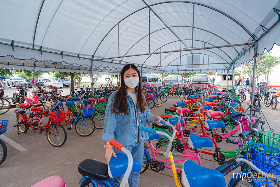 ที่เช่าจักรยานจะอยู่บริเวณทางเข้า ใกล้จุดบริการจำหน่ายตั๋ว ที่นี่มีจักรยานให้เลือกเยอะมาก มีหลายขนาดทั้งสำหรับเด็กและผู้ใหญ่ รวมถึงมีให้เลือกจักรยานปั่นคนเดียวราคา 40 บาทและจักรยาน 2 ตอนสำหรับปั่นคู่ราคา 80 บาท แถมไม่จำกัดระยะเวลาด้วย ส่วนใครที่มาเป็นครอบครัว มีเด็กแล็กและผู้สูงอายุ ที่นี่ก็มีรถกอล์ฟให้เช่าราคา 200 บาท/30 นาที