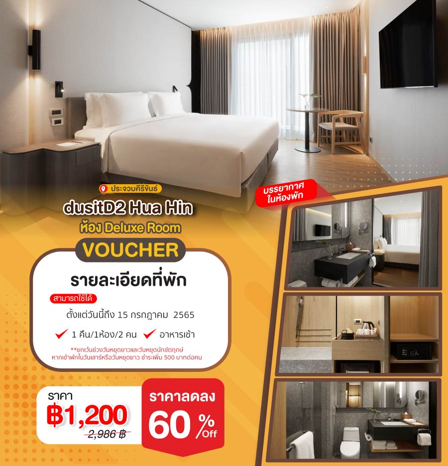 ดุสิตดีทู หัวหิน (dusitD2 Hua Hin) โรงแรมเปิดใหม่ใจกลางเมืองหัวหิน ที่สามารถเดินไปชายหาดและแหล่งช้อปปิ้งใจกลางเมืองได้เพียงไม่กี่นาที โรงแรมตกแต่งด้วยสไตล์โมเดิร์น ผสมผสานการตกแต่งด้วยดอกไม้ไทยที่เป็นเอกลักษณ์ เช่นดอกบัวที่เป็นจุดเด่นในทุกบริเวณ ดอกลำดวนที่ประดับตกแต่งอยู่บริเวณล็อบบี้ ดอกสี่กลีบที่ถูกตกแต่งไว้ภายในห้องพัก เป็นต้น โรงแรม ดุสิตดีทู หัวหิน พร้อมต้อนรับแขกผู้มาเยือนอย่างอบอุ่นตั้งแต่มาถึงที่ล็อบบี้ พร้อมทั้งยังมีสิ่งอำนวยความสะดวกครบครัน ไม่ว่าจะมาเป็นคู่ มากับเพื่อน หรือครอบครัวที่พาเด็กๆ มาด้วย ก็มีสระว่ายน้ำสำหรับเด็กและโซนคิดส์คลับให้บริการ ส่วนผู้ใหญ่สามารถผ่อนคลายได้ที่ริมสระว่ายน้ำไร้ขอบชั้นดาดฟ้า จิบเครื่องดื่มที่ “ส้มบาร์” ริมสระว่ายน้ำ และกินอาหารหลากหลายรสชาติที่ “คาเฟ่ซอย” ไม่เพียงเท่านั้นที่ ดุสิตดีทู หัวหิน ยังพร้อมต้อนรับสัตว์เลี้ยงของคุณอีกด้วย