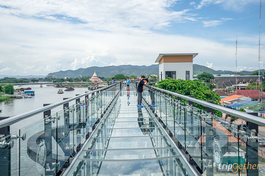 ปิดท้ายทริปด้วยแลนด์มาร์กสุดฮิต อย่าง สกายวอล์คเมืองกาญน์ ทางเดินกระจกใสยาวกว่า 150 เมตร สูงจากพื้นประมาณ 12 เมตร จากด้านบนสามารถมองเห็นการบรรจบกันของ แม่น้ำแควใหญ่ และ แม่น้ำแควน้อย ก่อนจะไหลรวมเป็น แม่น้ำแม่กลอง โดยมีแนวเขาสีเขียวเป็นฉากหลัง สวยอย่างกับภาพวาด จุดเด่นคือสามารถชมวิวแม่น้ำทั้งสามสายได้แบบ 360 องศา ทางเดินกระจกใสให้ความรู้สึกตื่นเต้น แต่ปลอดภัย ถ่ายรูปออกมาสวยทุกมุม โดยเฉพาะช่วงเย็นถึงค่ำ ที่จะมีการเปิดไฟประดับ สวยอลังการเหมือนสวรรค์กลางน้ำเลยทีเดียวล่ะ