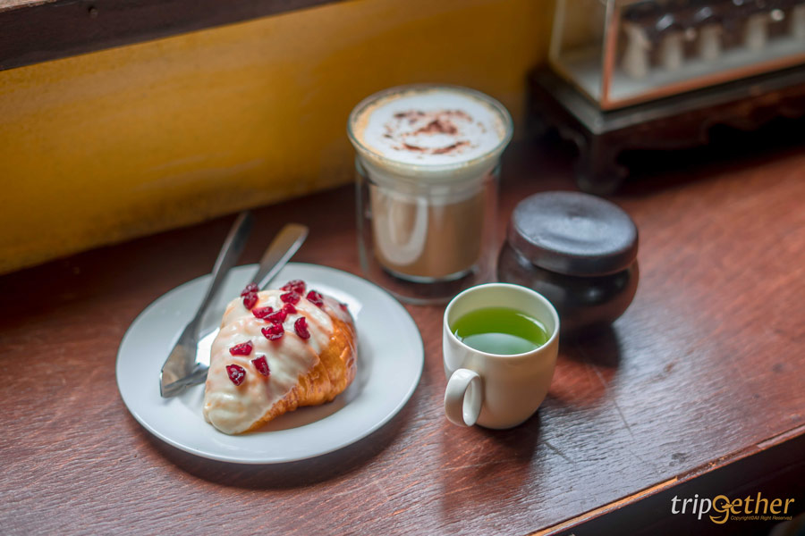 เมนูที่ลองคือ คาปูชิโน่ร้อน รสชาติเข้ม กลมกล่อม ฟองนมนุ่มละมุน สั่งมากินคู่กับ ครัวซองต์แครนเบอร์รี่ไวท์ช็อกโกแลต ฉ่ำๆ หอมเนย นั่งชิลล์ให้หายเหนื่อย ก่อนออกเดินเที่ยวต่อ