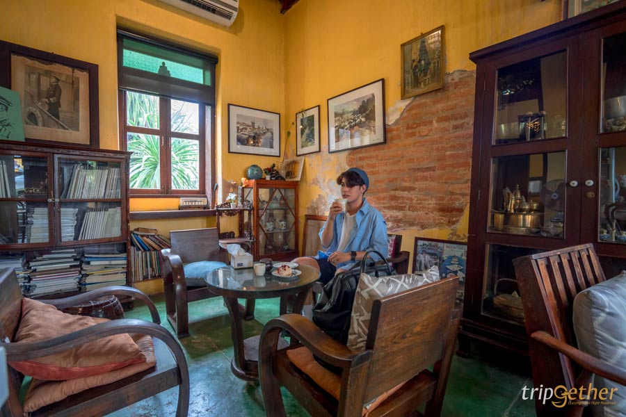 ภายในเปิดเป็นคาเฟ่บรรยากาศดี มีที่นั่งทั้งโซนอินดอร์ที่ตกแต่งด้วยของเก่า เฟอร์นิเจอร์วินเทจ และโซนเอาท์ดอร์ด้านหลังที่โปร่งโล่ง นอกจากนี้ยังสามารถขึ้นไปบนดาดฟ้า เพื่อชมวิวชุมชนเก่าถนนปากแพรก และแม่น้ำแควใหญ่แบบพาโนราม่า
